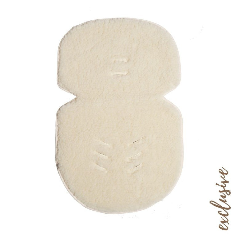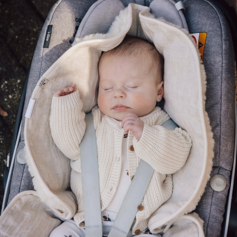 Alwero omkeerbare inleg voor Maxi-Cosi van wol en linnen. Aan de ene kant is de inleg gemaatk van 100%, aan de andere kant is linnen het gebruikte materiaal. Aan de achterkant zitten gaten voor de riempjes van de Maxi-Cosi.