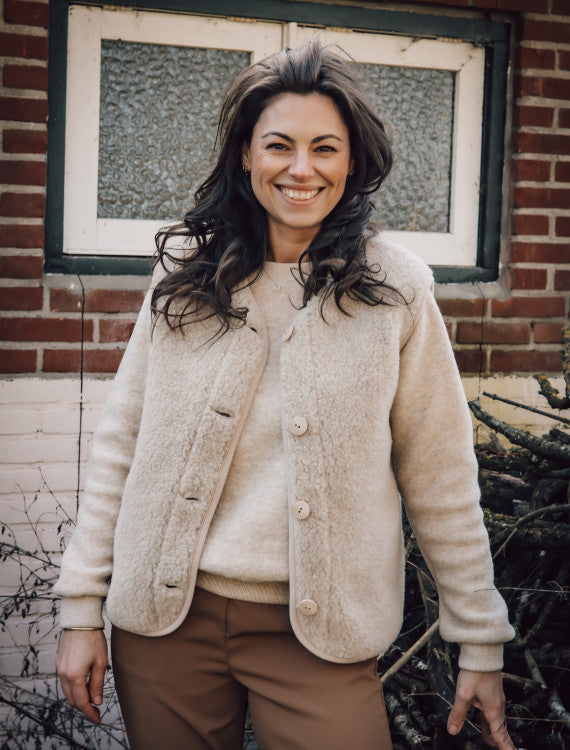 De bodywarmer PO voelt heerlijk zacht en licht aan en is gemaakt van een elastische wol. Deze bodywarmer heeft 4 knopen om de bodywarmer te sluiten. Het is gemaakt van 100% wol en is niet gevoerd.