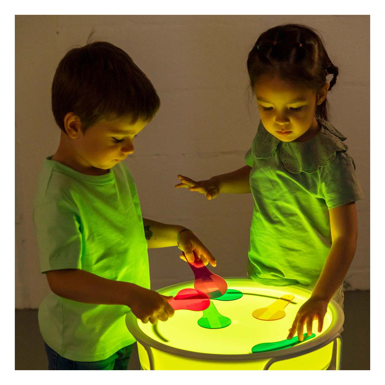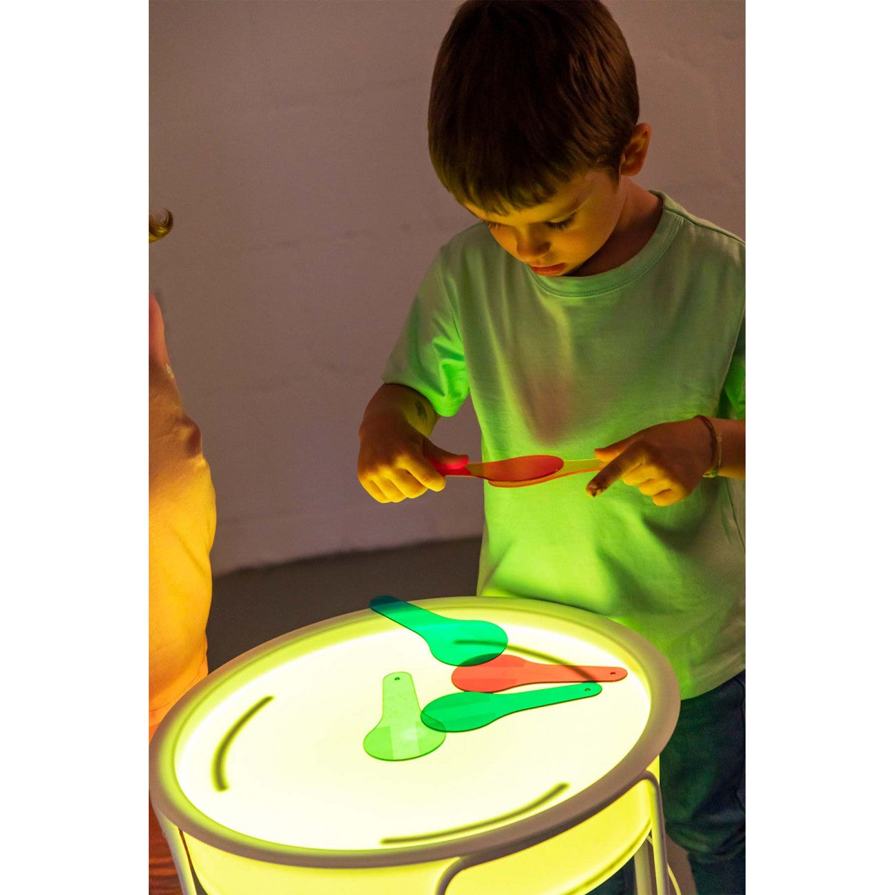 Op een lichttafel kunnen kinderen experimenteren met het stapelen van paletten, verschillende combinaties proberen, en observeren hoe het licht door de kleuren heen filtert. Ze zien direct het resultaat van hun kleurexperimenten en kunnen eindeloos variëren en ontdekken.
