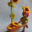 Deze vrolijke kabouter is hard aan het werk met zijn houten kruiwagen vol oogst en zonnebloemen.