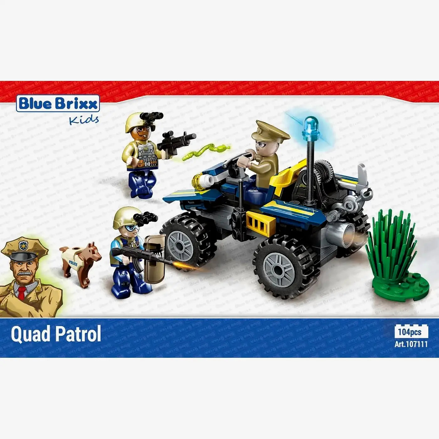 De BlueBrixx Quad-Patrouille set is een off-road politievoertuig met 104 onderdelen waar actie en avontuur centraal staan. De set bevat drie agentenfiguren en een politiehond, plus een quad met sleepwinch op de achterzijde. Dit voertuig werkt goed in samenhang met andere bos-politie-sets: ideaal voor reddingsacties, achtervolgingen of bewaking in ruig terrein.