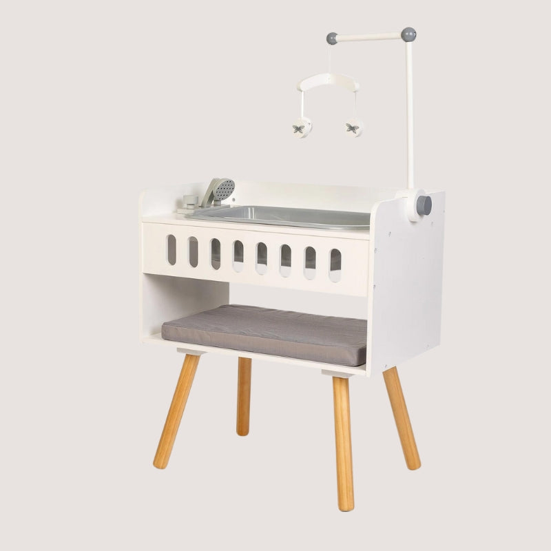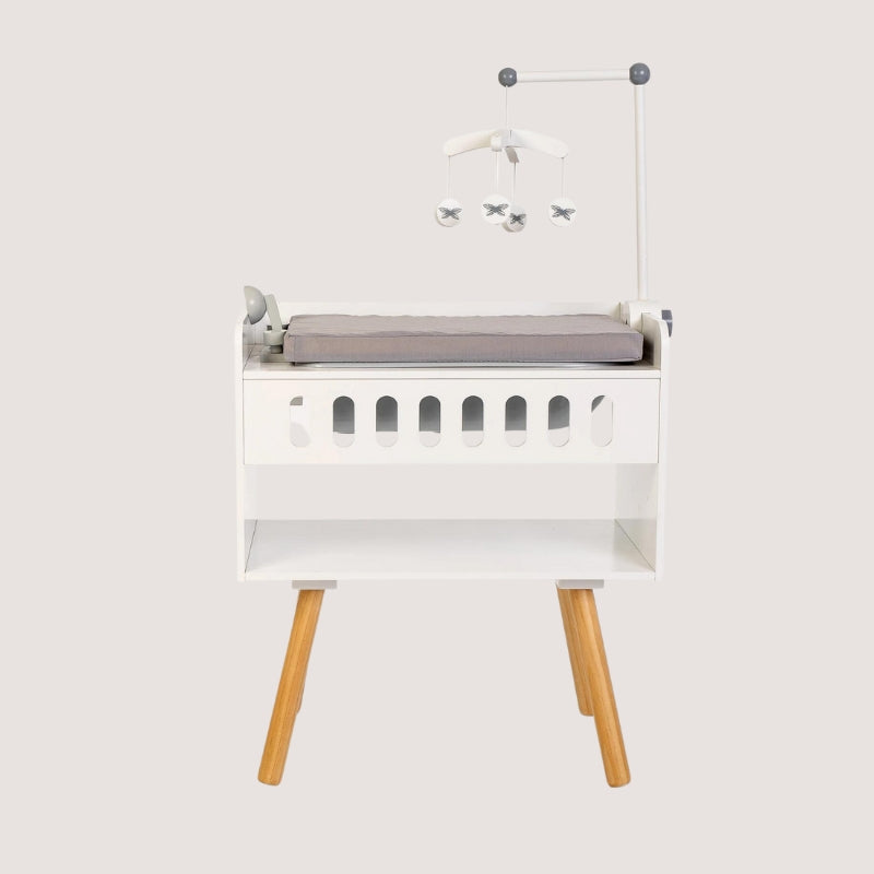 Door de aankleedplank op het bad te leggen wordt het bad getransformeerd tot omkleedtafel. Bovenaan de omkleedtafel hangt een mooie mobiel. Het plankje onder de commode kan gebruikt worden om kleren, luiers, badproducten of handdoeken te bewaren.