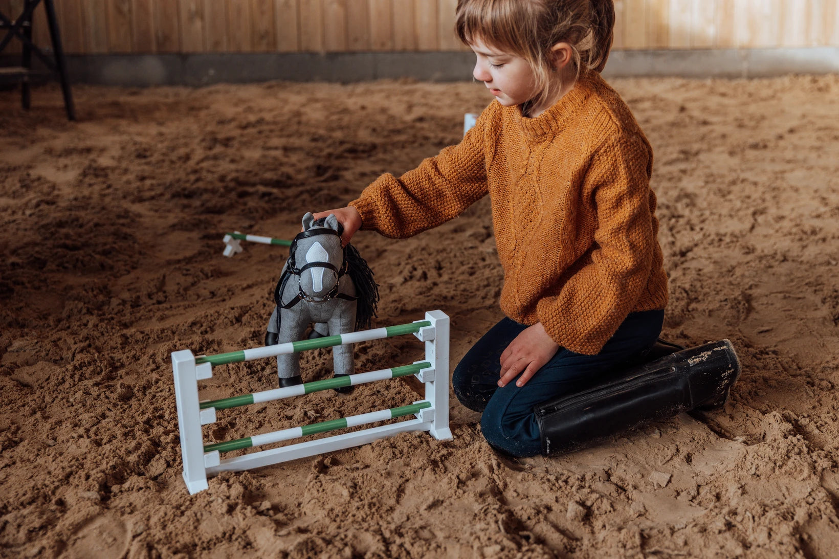 De balken hebben praktische afmetingen (84 x 2,5 x 4,5 cm) die perfect passen bij knuffelpony's, waardoor het spel realistisch en uitdagend wordt. Het product kan uitstekend worden gecombineerd met andere hindernissen voor het opzetten van complete parcouren en het organiseren van spannende ponywedstrijden.
