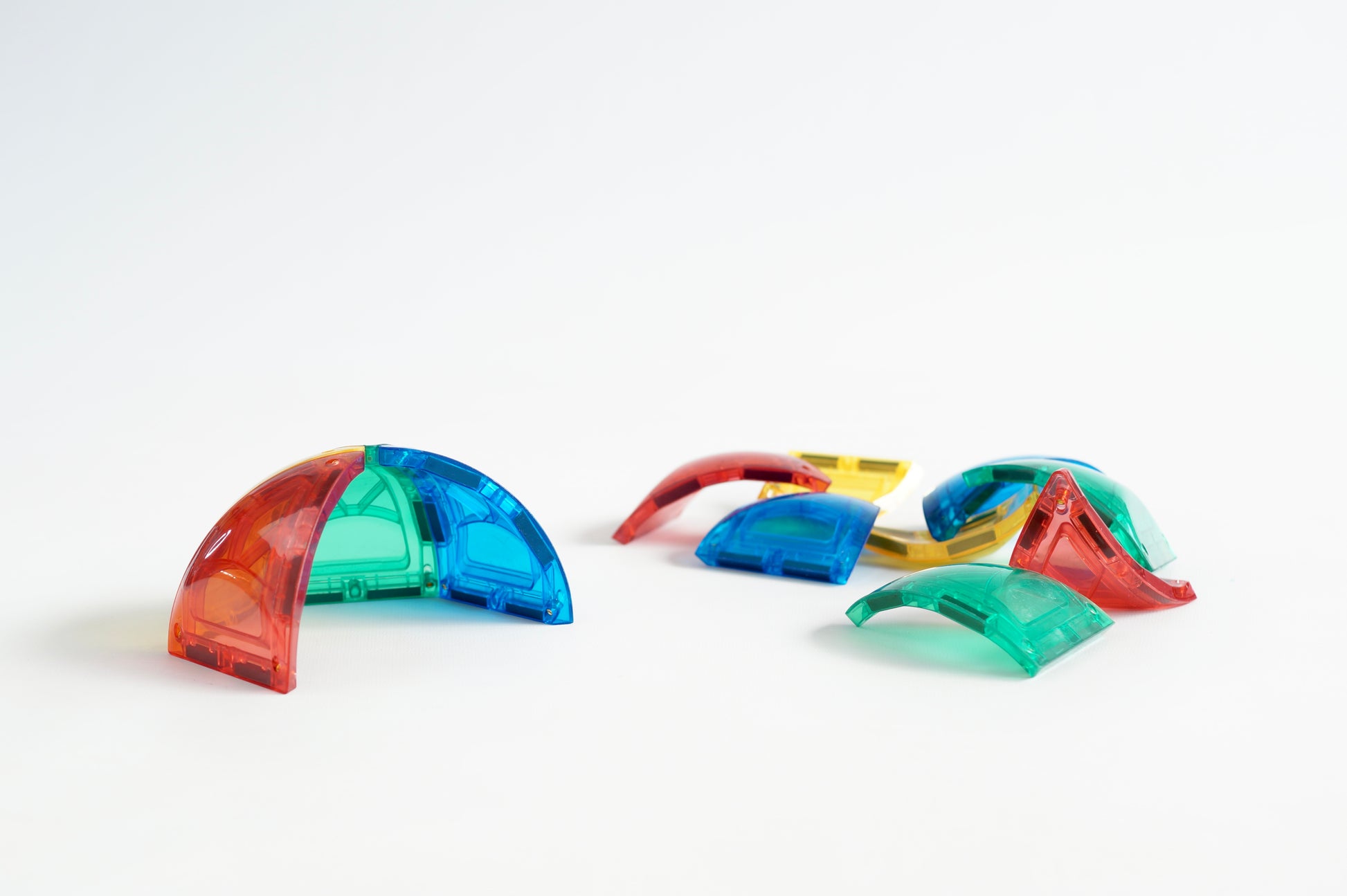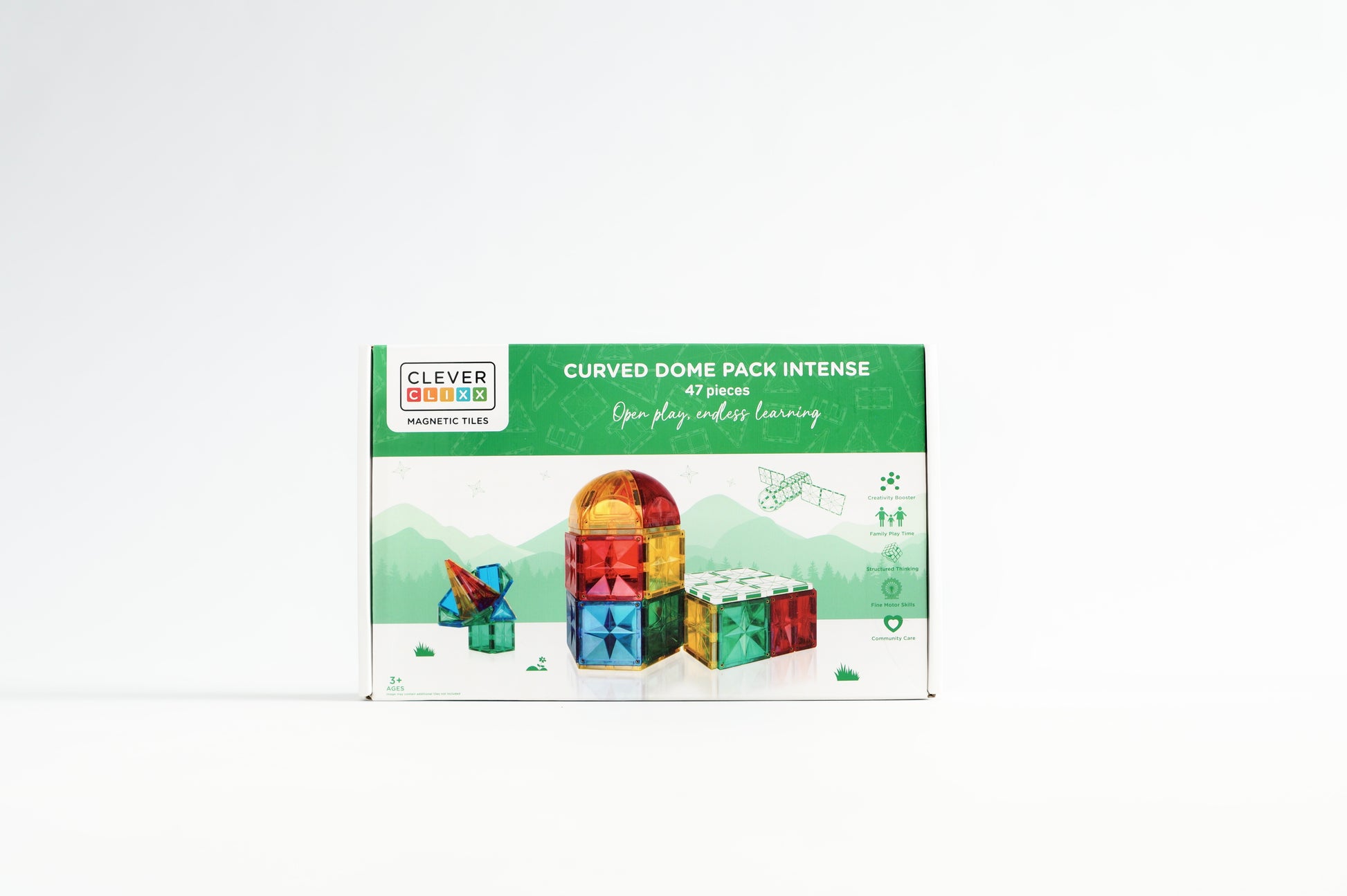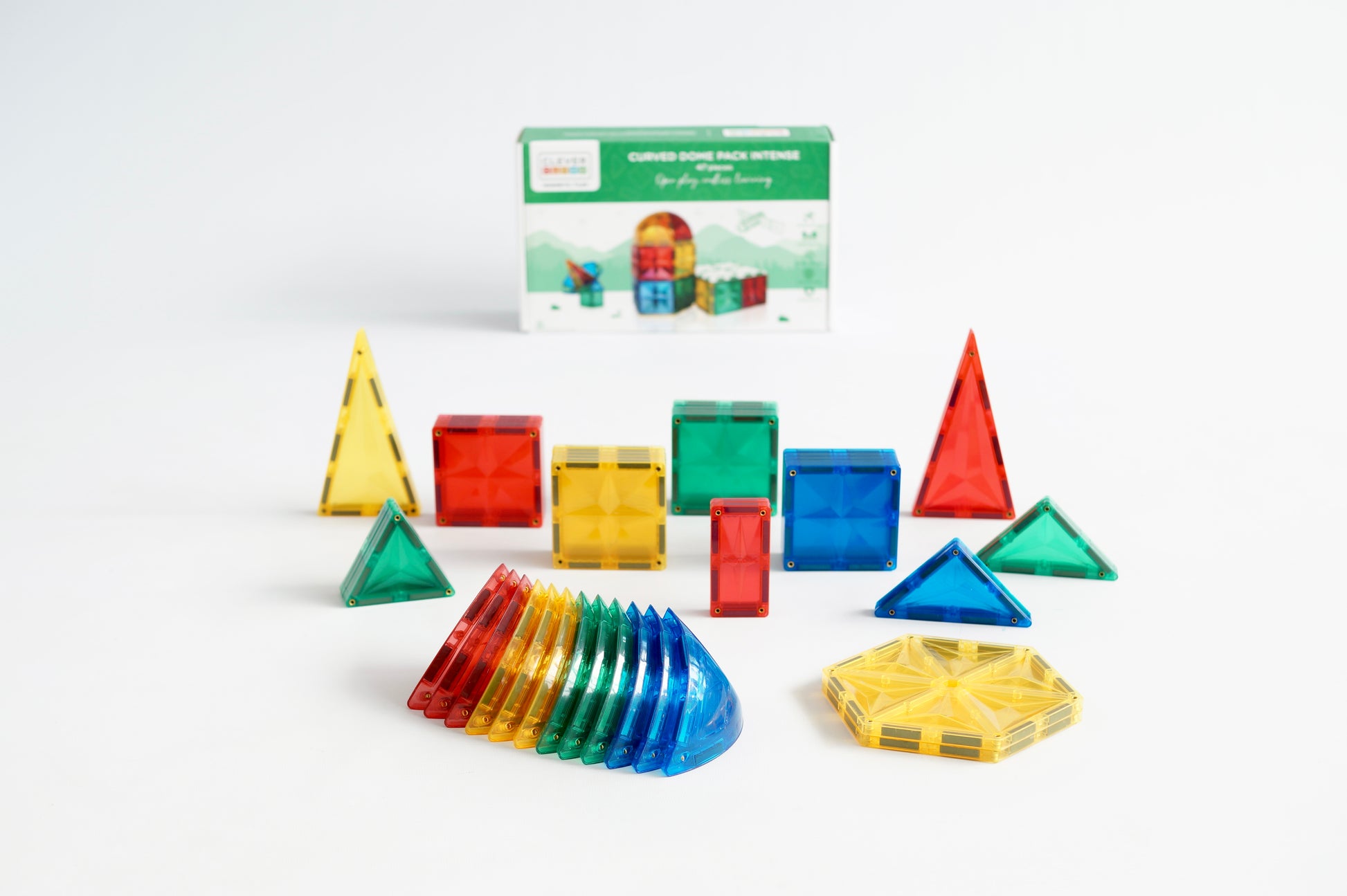 De Curved Dome Pack Intense bevat 47 magnetische bouwtegels, waaronder unieke gebogen vormen, ideaal voor het creëren van bogen en koepels. Deze set is gemaakt van BPA-vrij plastic en bevordert de ontwikkeling van motorische vaardigheden en ruimtelijk inzicht bij kinderen vanaf 3 jaar.