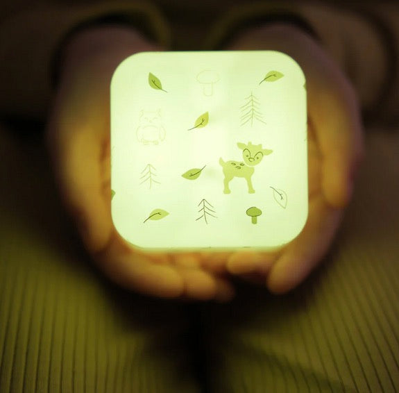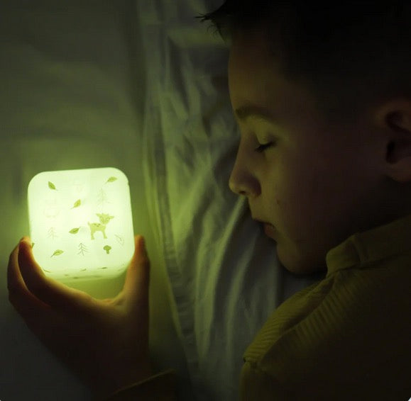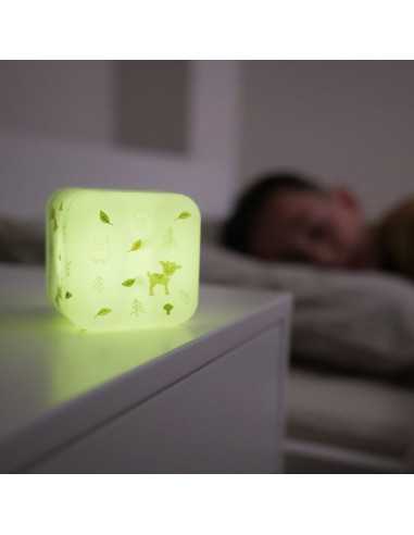 De Cube B™ – Forest zorgt voor rust en comfort tijdens het slapengaan. Dit nachtlampje heeft een slim tweedelig ontwerp dat samen een verlichte kubus vormt en kan zowel in het stopcontact worden gebruikt als los worden meegenomen. Met de tap-sensor wissel je eenvoudig tussen een zachte witte gloed en een rustgevend groen licht en stel je de helderheid naar wens in. Dankzij het compacte formaat kunnen ook oudere kinderen het lampje zelf meenemen om hun weg in het donker te vinden. Na 30 minuten schakelt het lampje automatisch uit, zodat de nacht ongestoord verloopt. Gemaakt van 30% gerecycled kunststof en direct oplaadbaar via het stopcontact is de Cube B™ – Forest bovendien een duurzame keuze.