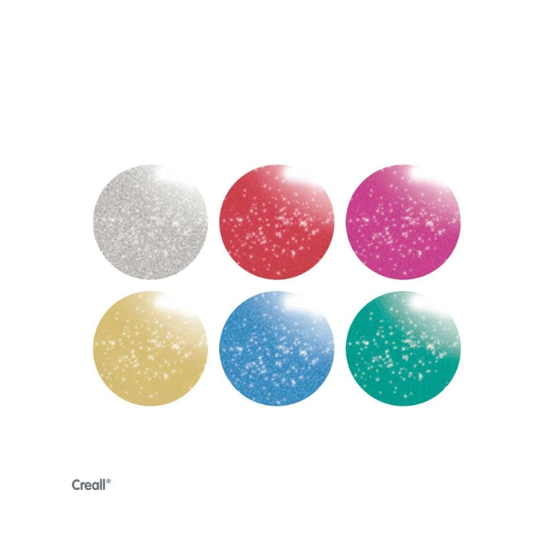 Met de glitterlijm van Creall zijn er eindeloze creatieve mogelijkheden. Deze set bestaat uit 6 flesjes glitterlijm van elk 100 ml in 6 prachtige kleuren. De glitterlijm is geschikt voor gebruik op papier, hout en karton, waardoor het vaak tijdens het knutselen gebruikt kan worden. De sprankelende kleuren van deze glitterlijm voegen een magische uitstraling toe aan alle knutselwerken.