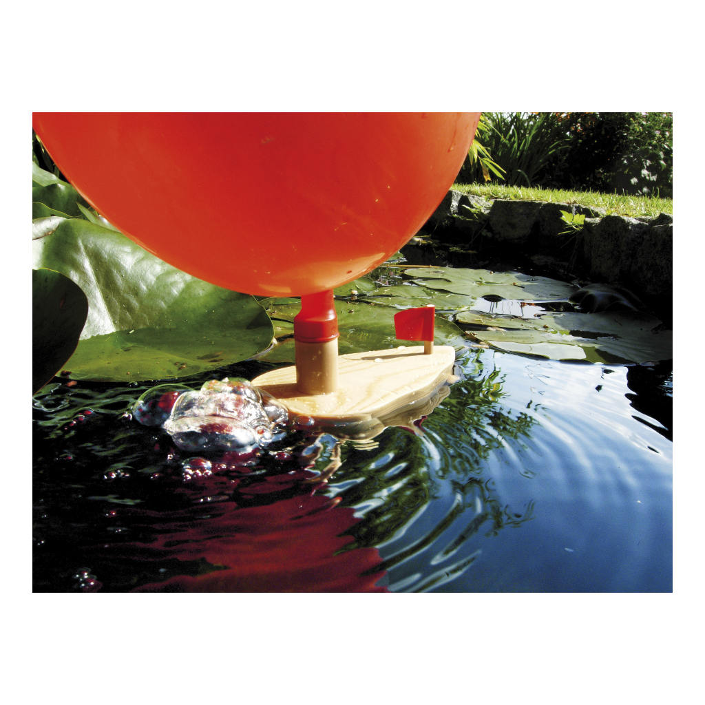 Een leuk Houten Ballon Bootje wat aangedreven wordt door een ballon. Door de druk die de ballon uitblaast raast de boot over het water.