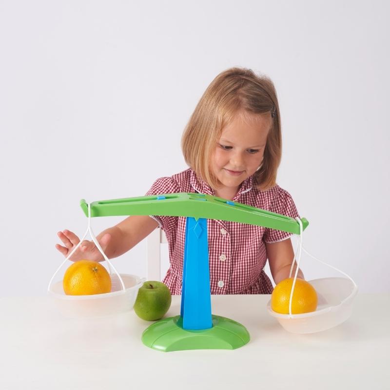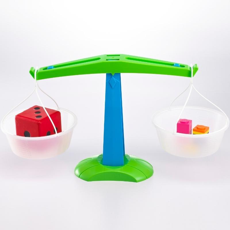 Combineer de weegschaal met waterbeads, gekleurde rijst, of kinetisch zand of sorteerspeelgoed.
