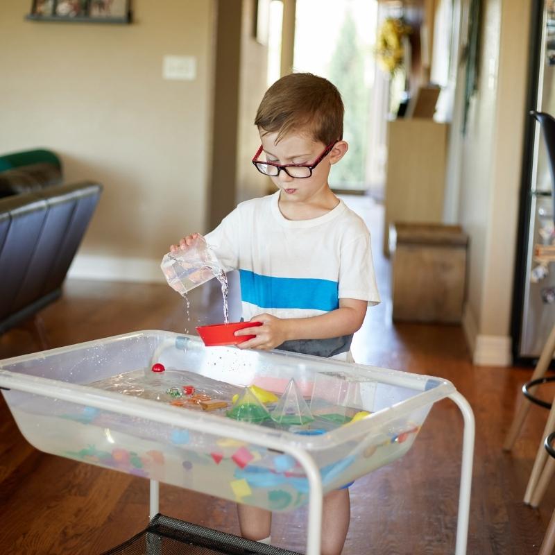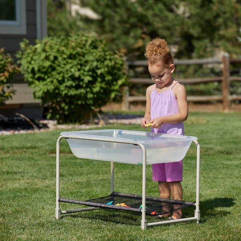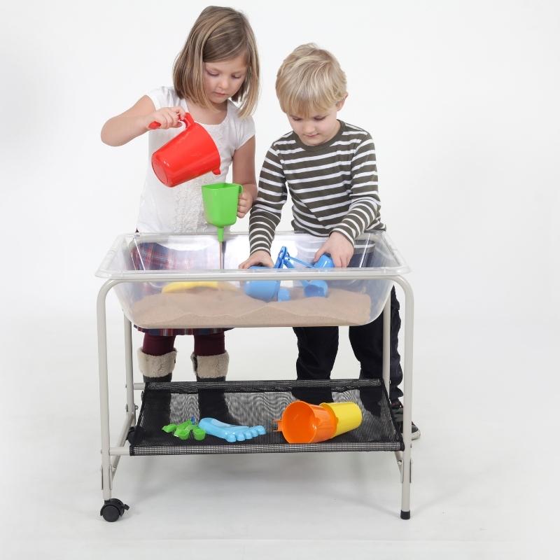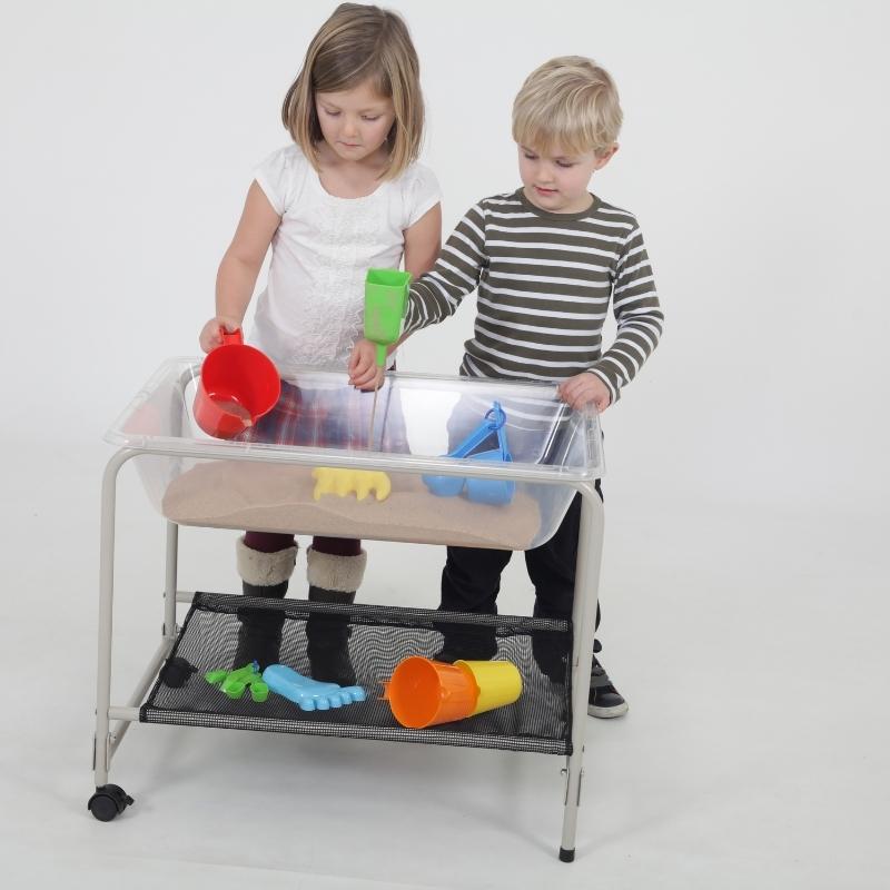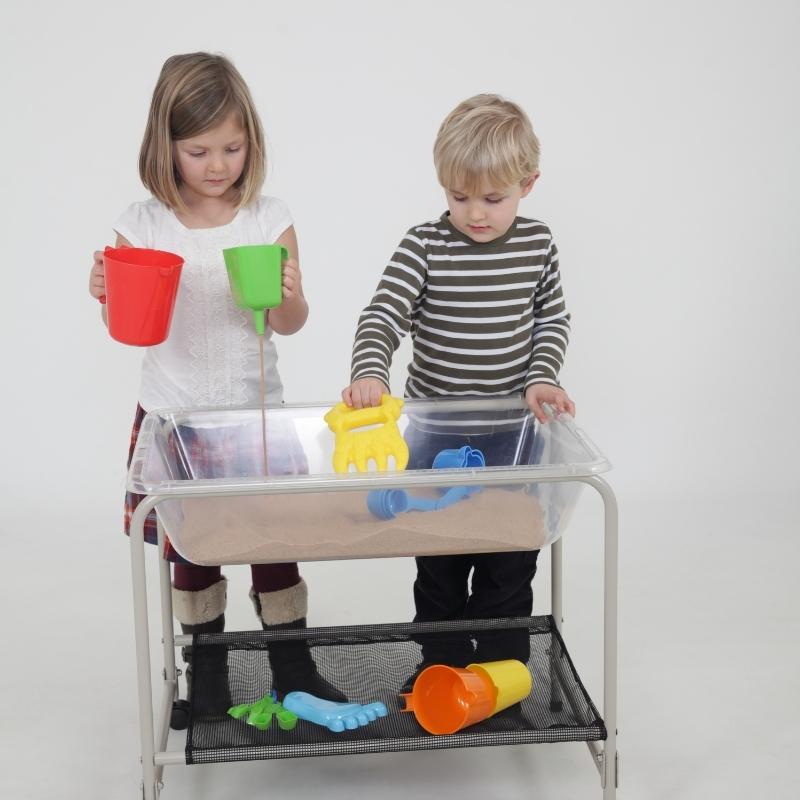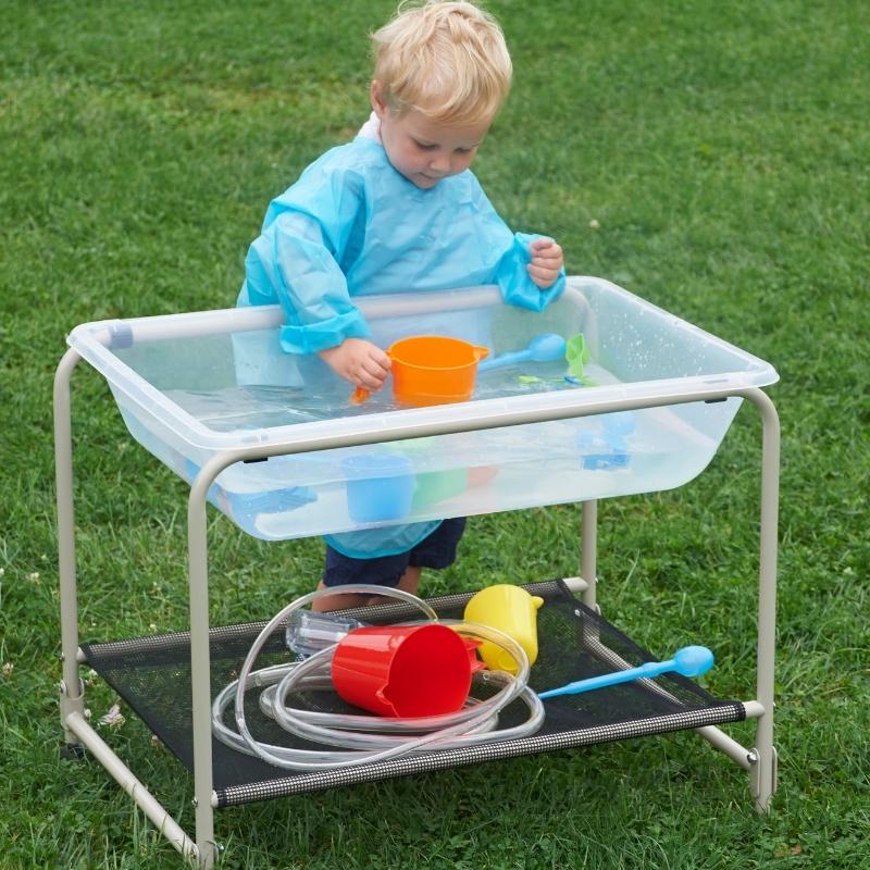 Dit opvouwbare onderstel is gemaakt van een stevig stalen frame met een nylon net en hoort bij de EDX transparante zand- en water bak. Met twee wielen om de zand- en watertafel gemakkelijk te verplaatsen.