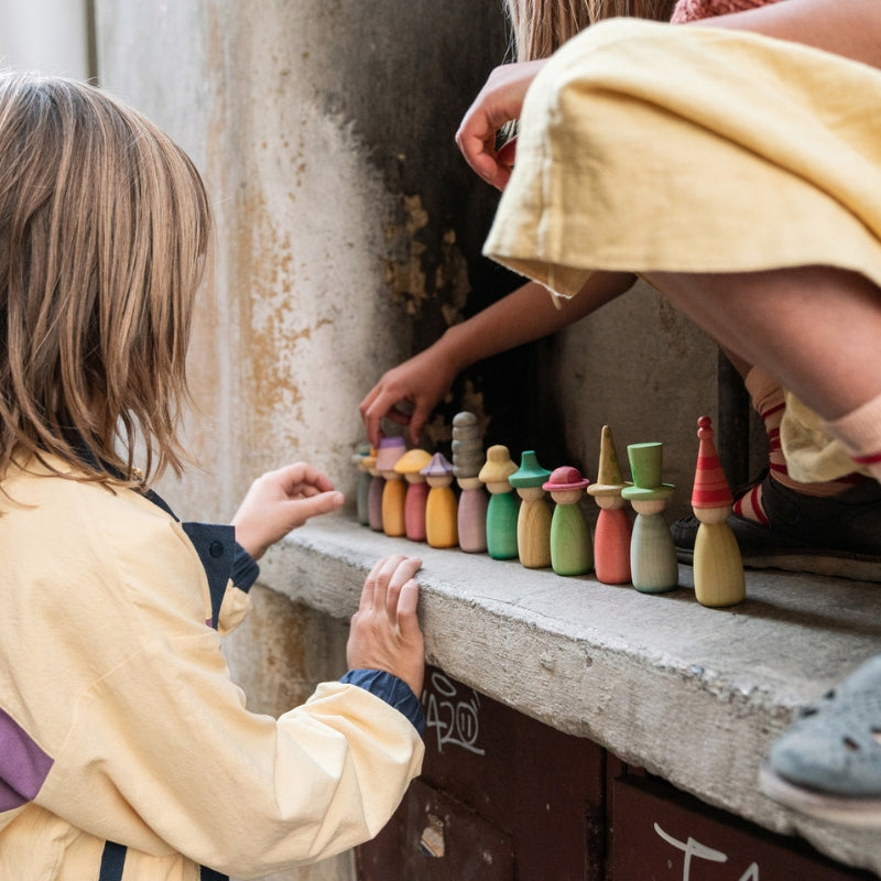 De Fancy nins® van Grapat zijn een set van 12 houten poppetjes, elk met de hand geschilderd in verschillende kleuren. Elk poppetje heeft een vrolijk hoofddeksel die ze graag met elkaar uitwisselen! De poppetjes zijn handgemaakt van duurzaam geteeld hout en zijn met niet-giftige verf geverfd.