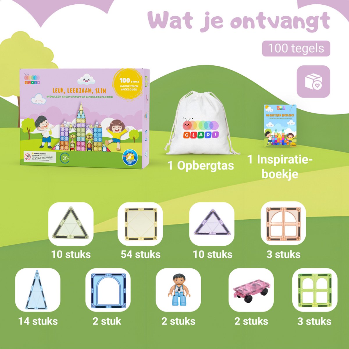 100 stuks magnetisch speelgoed (magnetic tiles) Pastel met sterke magnetische kracht voor stabiele bouwwerken. De tegels klikken soepel aan elkaar en blijven goed vastzitten, zodat kinderen veilig en veelzijdig kunnen bouwen: torens, huizen en patronen. Veel positieve reviews benadrukken de krachtige magneten en de degelijke afwerking. Gladi is bekroond als Speelgoed van het Jaar 2025.