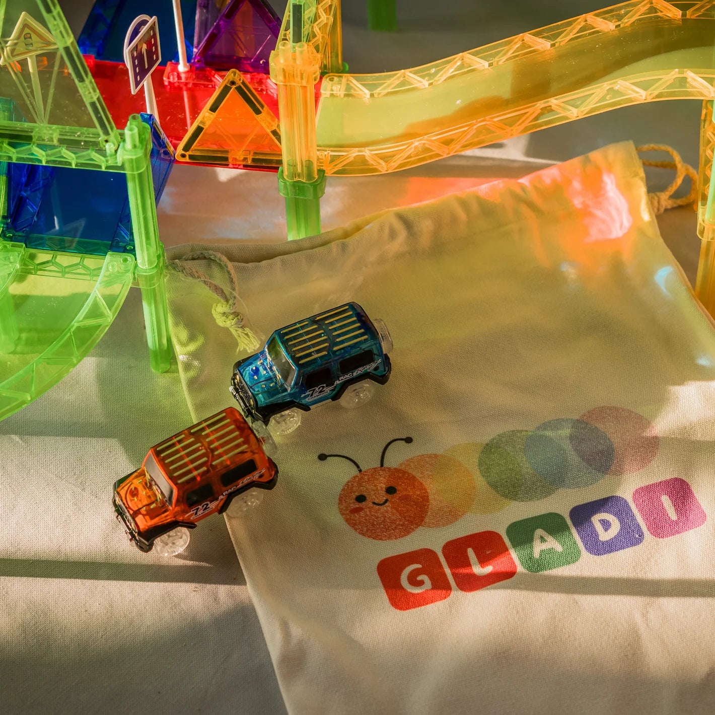 Gladi Tiles - 2 racebaan auto's - Magnetic Tiles - Magnetisch Speelgoed