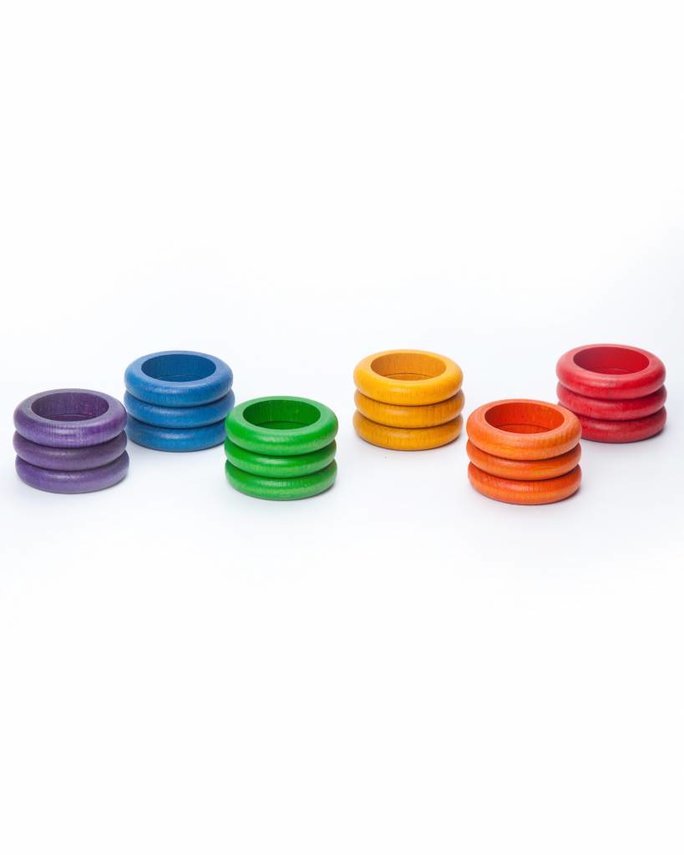 18 ringen in mooie heldere regenboogkleuren. Het idee achter dit speelgoed is dat het de fantasie van kinderen stimuleert. Dat zij helemaal vrij zijn om te bepalen welk doel het speelgoed dient en wat voor spel ze erbij verzinnen.