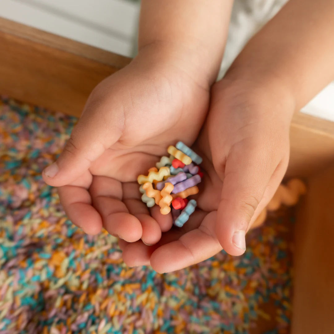 De heldere regenboogkleuren en natuurlijke vormen zorgen voor een uitnodigende speelomgeving en maken de set perfect voor sensorisch spel, loose parts play en thematafels. Deze speelset stimuleert fijne motoriek, hand-oog coördinatie en creativiteit, terwijl kinderen zelfstandig en op hun eigen manier spelenderwijs leren en bouwen.