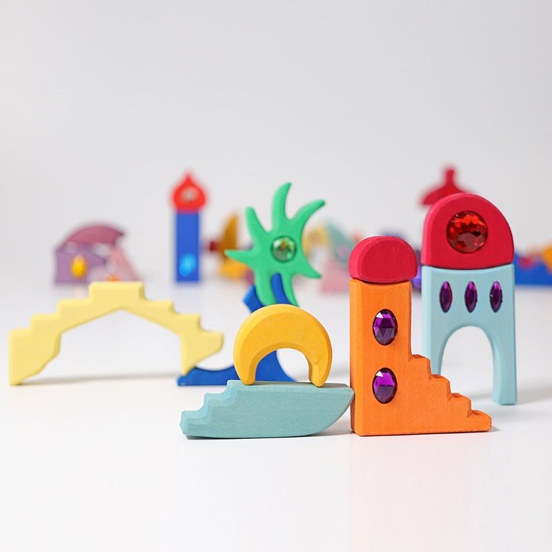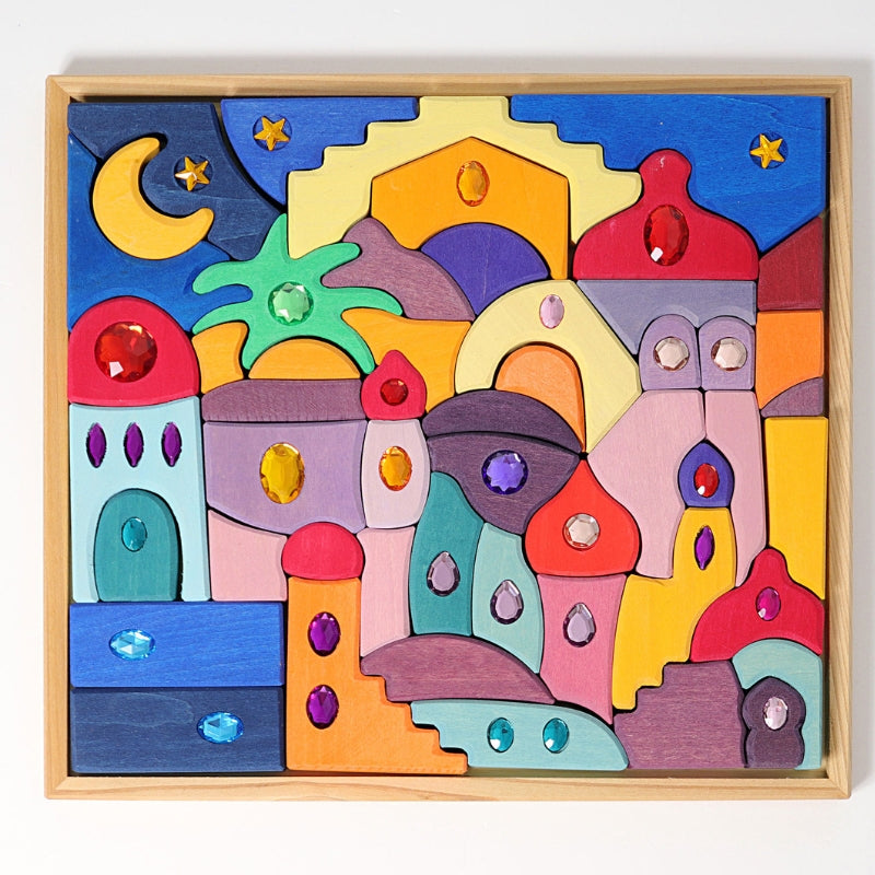 Deze glinsternde blokkenset bestaat uit prachtige geometische vormen in oosterse sferen! Met 52 gekleurde vormen kun je vele mooie opstellingen maken zoals landschappen of steden! Door de stukken te stapelen en vormen te combineren ontstaan er telkens weer nieuwe plaatjes. Zo biedt dit speelgoed tal van mogelijkheden. Het materiaal bestaat uit lindehout. Bewerkt met natuurlijke verfstoffen. Dit alles gemaakt met veel liefde en arbeid in kleine fabrieken in Duitsland en Bosnië.