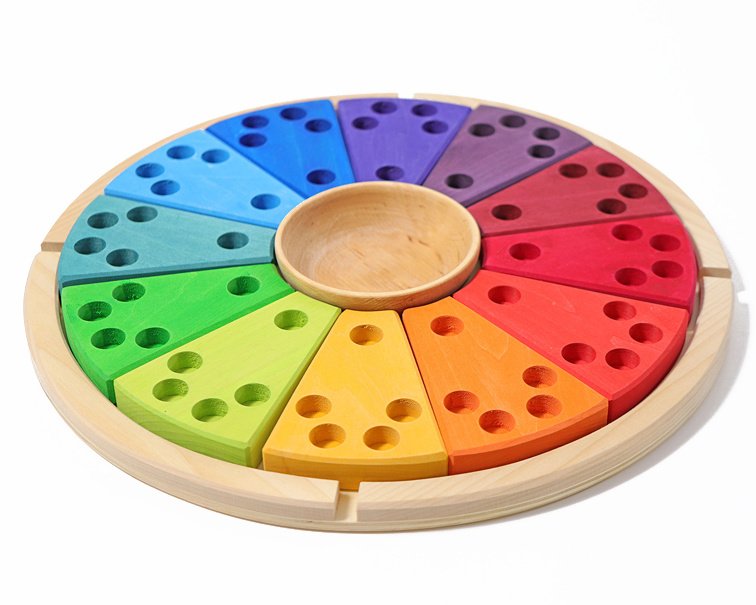 Met deze mooie houten jaarring van Grimm's wordt het verstrijken van de tijd visueel en inzichtelijk voor kinderen. De 12 gekleurde delen geven de maanden weer. In elk deel zitten 5 gaten; 4 voor de weken en 1 voor een steker die de maand verbeeldt. Voor ieder feest of seizoen zijn er passende figuren en cijfers verkrijgbaar. Bijvoorbeeld deze set.