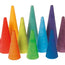 Deze set van 12 houten kegels vormen samen een prachtig regenboogbos. Heel leuk in combinatie met de Grimm's regenboog of andere bouwsets van Grimm's. Perfect voor het sorteren van kleuren, deze set heeft dezelfde kleuren als de 12 delige regenboog van Grimm's.