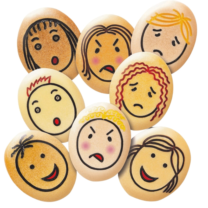 Gegoten uit een unieke mix van hars en echte steen, de set is duurzaam genoeg voor gebruik in zand en water, binnen en buiten, en biedt volop gelegenheid om emoties in verschillende omgevingen te verkennen. Elke set bevat 8 stenen (7 cm in doorsnede). Veilig voor kinderen vanaf 2 jaar.