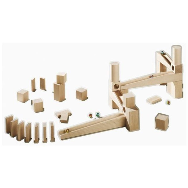 Geweldig basispakket houten knikkerbaan. Een knikkerbaan laat op een speelse manier het verband tussen oorzaak en gevolg ervaren.