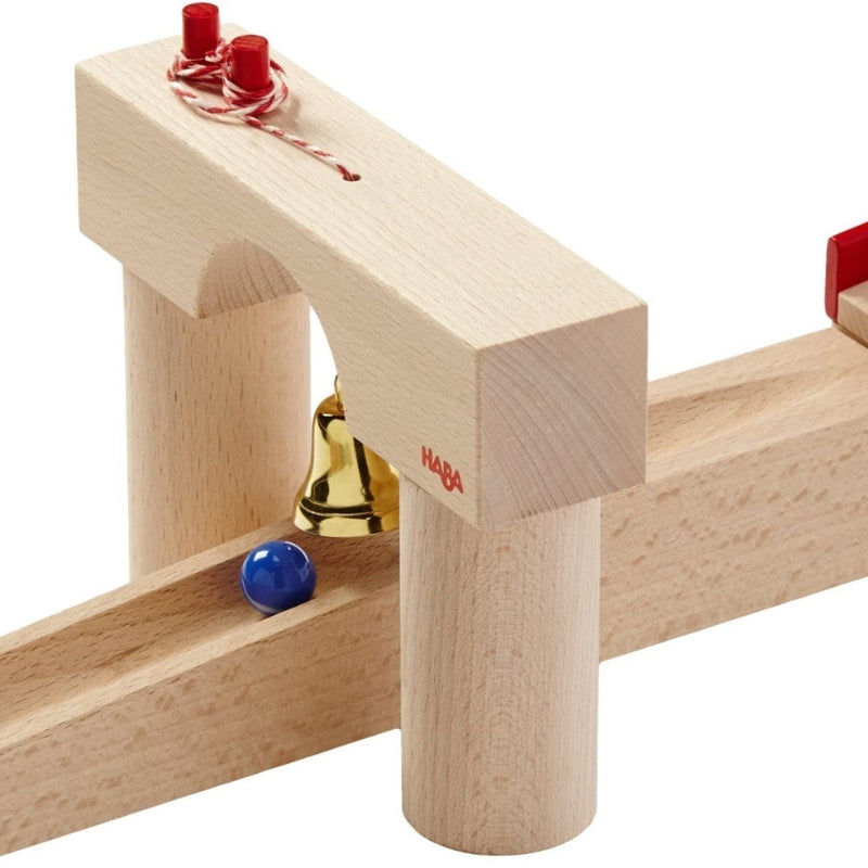 Plan, bouw, speel! Met deze grote basisset van HABA kent fantasie geen grenzen! 42 massief beukenhouten onderdelen nodigen bouwers vanaf 4 jaar uit om te experimenteren. De knikkerbaan laat op een speelse manier het verband tussen oorzaak en gevolg ervaren. Hoge torens verrijzen hier, kleine bogen daar. Meerdere gangen verbinden alle componenten met elkaar. Hierdoor ontstaat een geweldige knikkerbaan waarop de knikkers richting de vallei kunnen rollen. Een vrolijk gerinkel klinkt wanneer de knikkers onder de boog rollen met de bel.