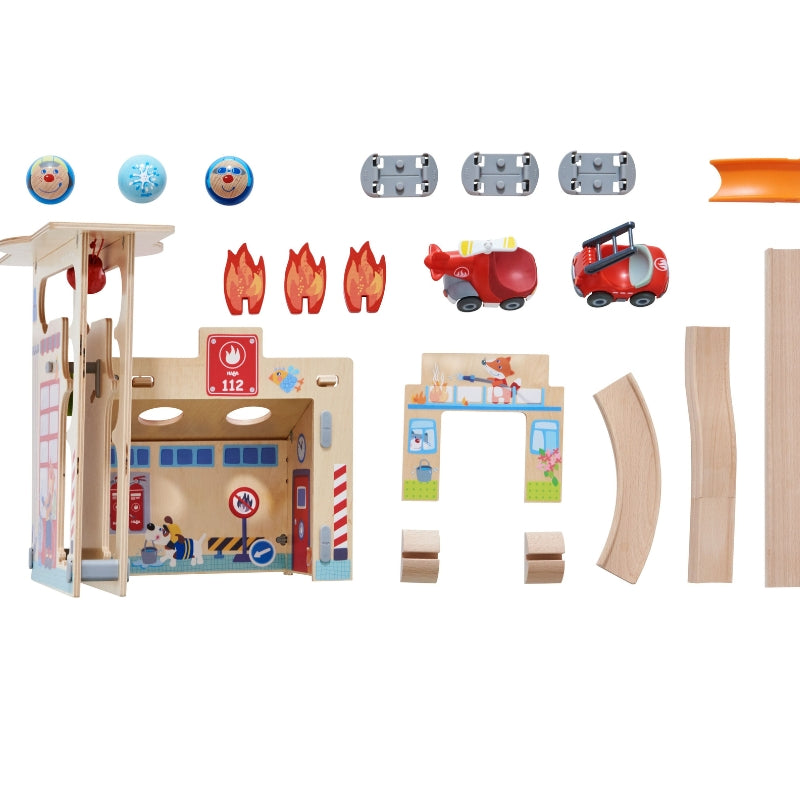 Inhoud: 1 brandweerkazerne, 1 poort, 1 brandweerwagen, 1 brandweerhelikopter, 1 knikker helikopterpiloot Hannes, 1 knikker brandweerman Florian, 1 helling, 1 recht baanstuk, 1 bocht, 1 vertrekhelling, 1 knikker water, 3 brandstenen, 3 verbindingsstukken.