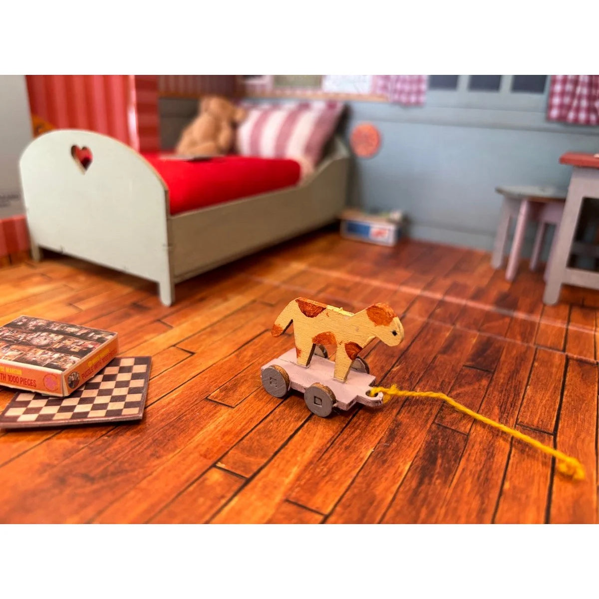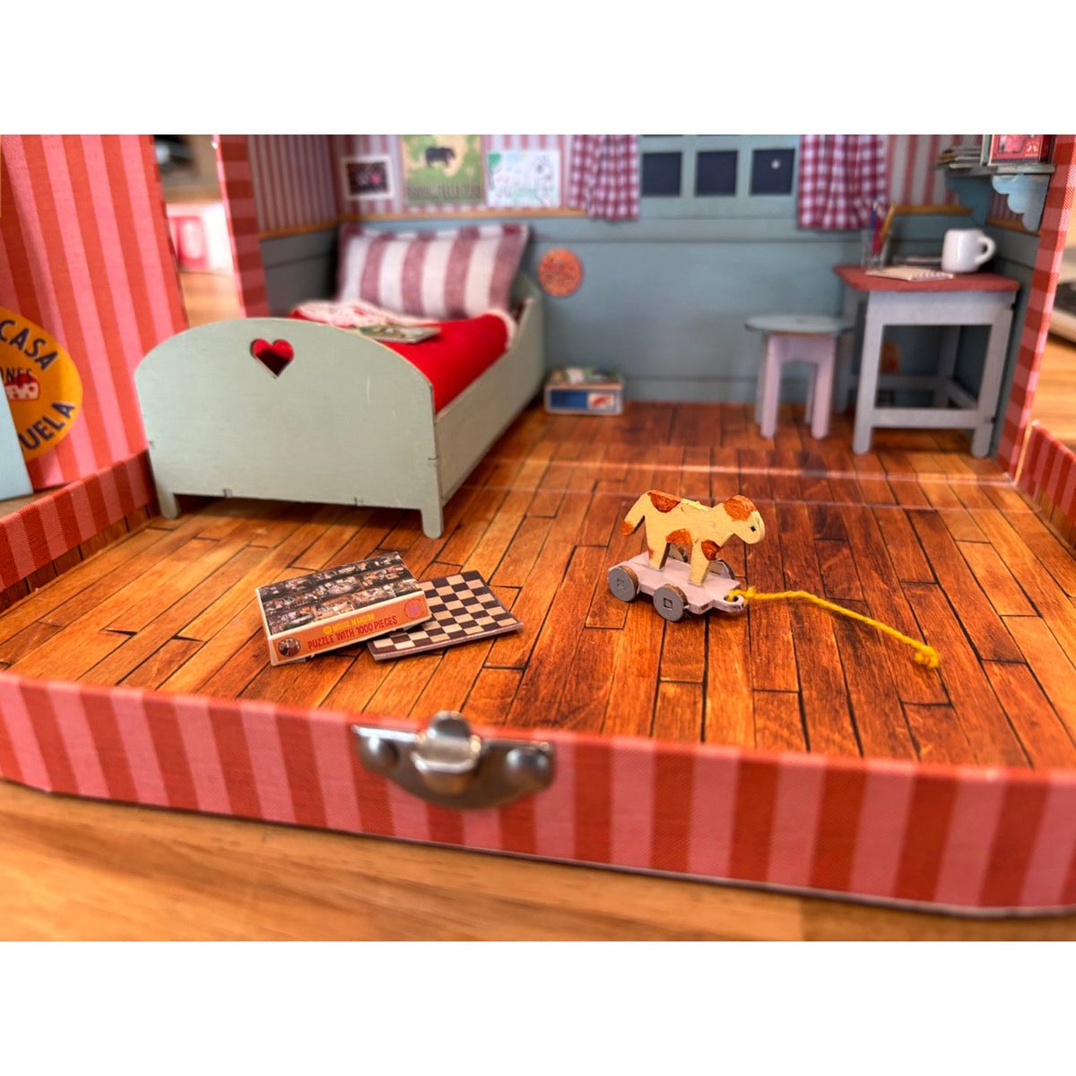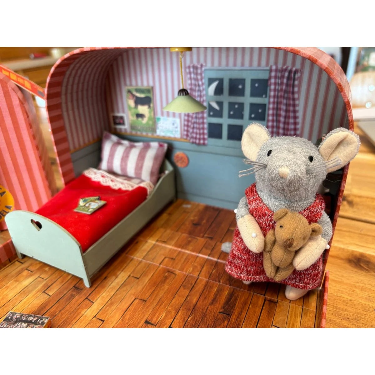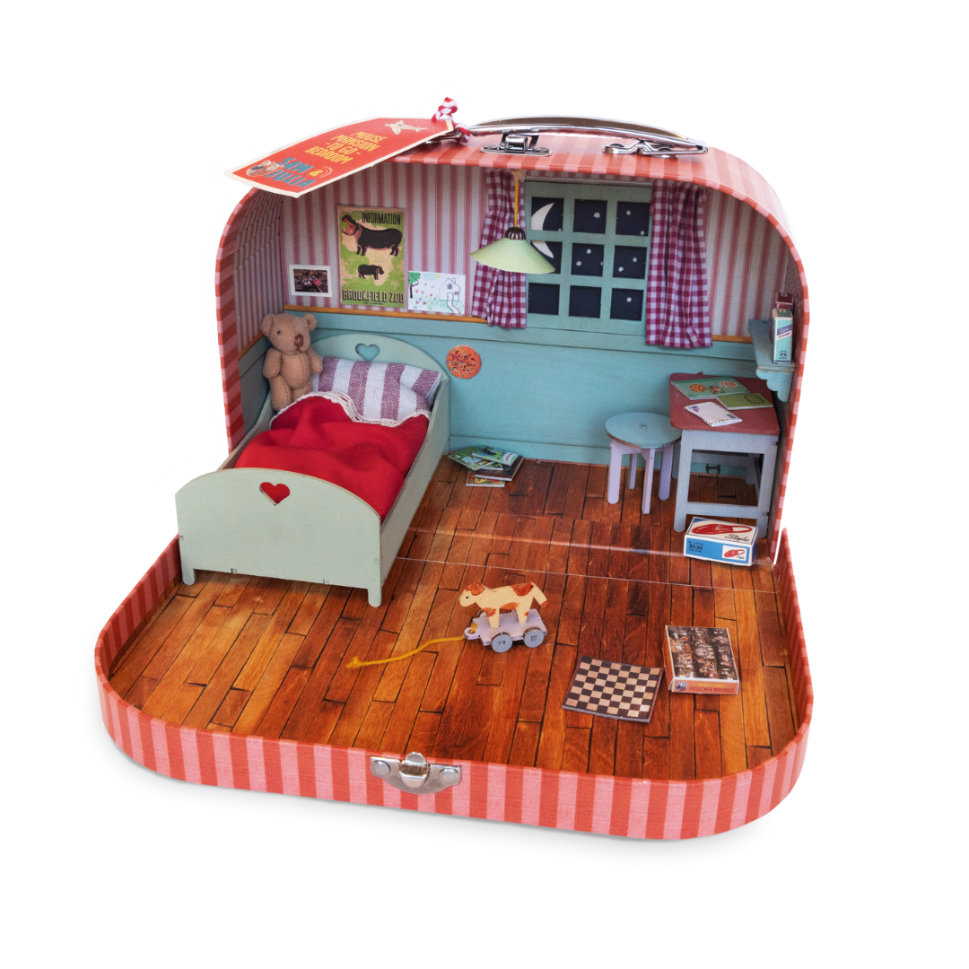 Dit kartonnen miniatuur koffertje met inhoud is al mooi bedrukt. Het bevat aan alle kanten schattige, karakteristieke behangetjes en een kartonnen vloertje. Maak het koffertje zelf af met meubeltjes en mini's en de muisjes kunnen naar hartenlust hun verhalen beleven of ontspannen.