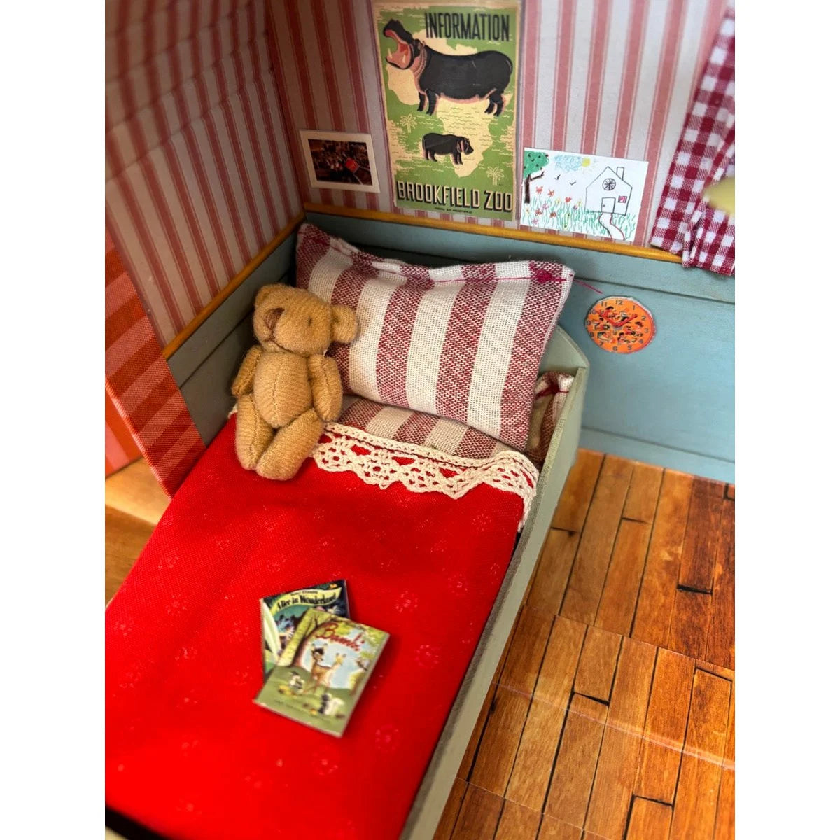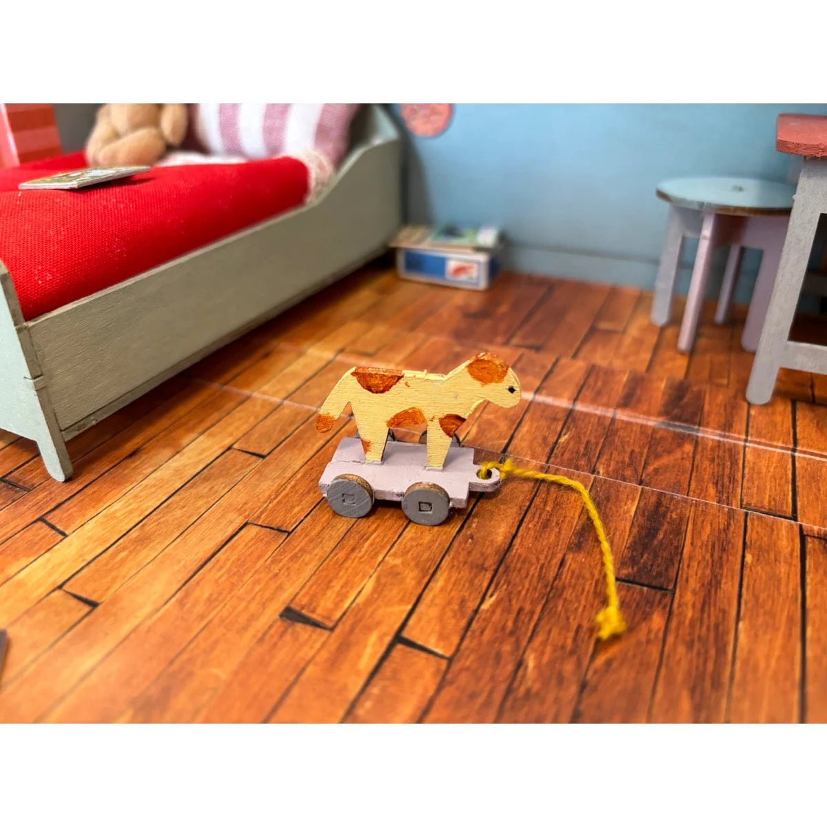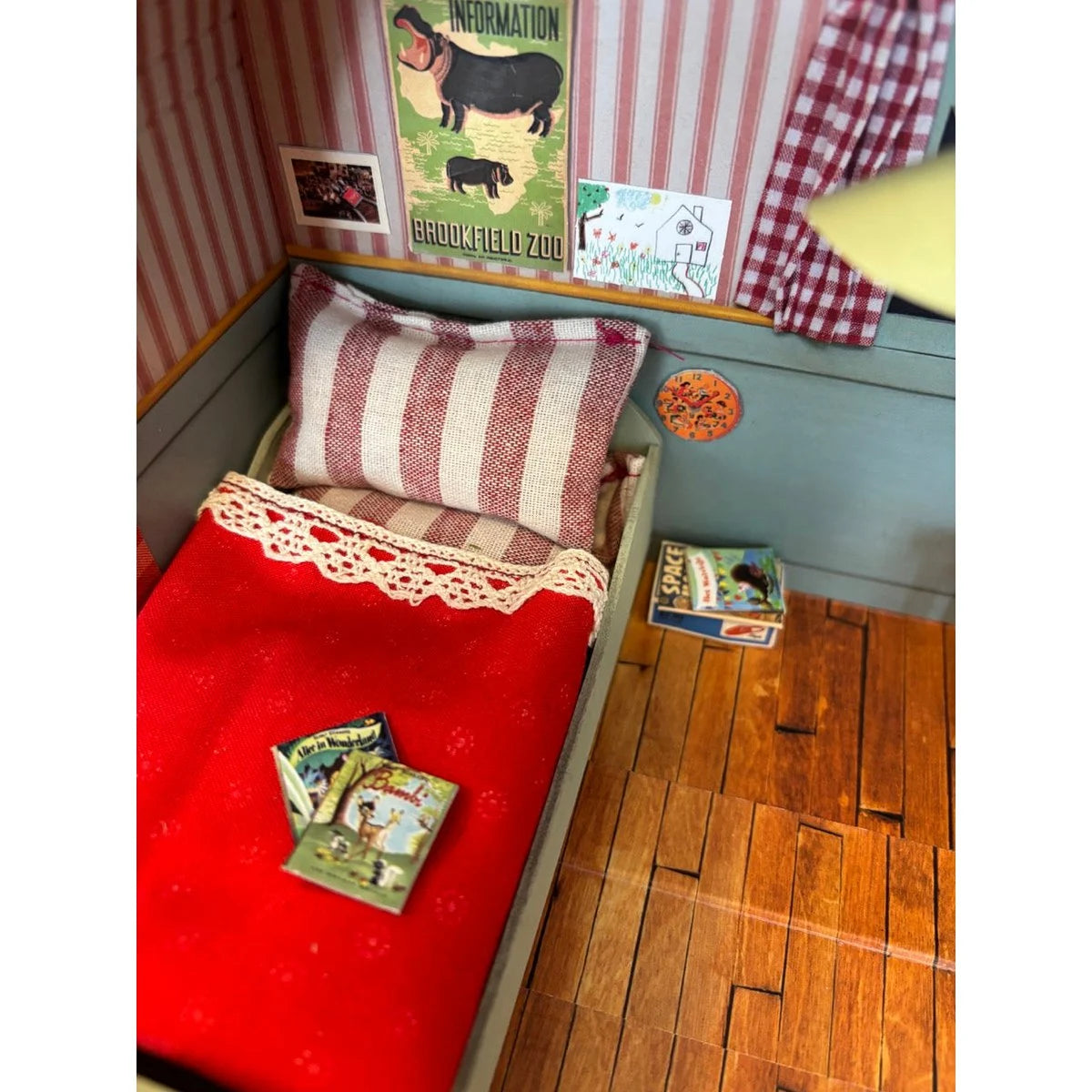 Dit kartonnen miniatuur koffertje met inhoud is al mooi bedrukt. Het bevat aan alle kanten schattige, karakteristieke behangetjes en een kartonnen vloertje. Maak het koffertje zelf af met meubeltjes en mini's en de muisjes kunnen naar hartenlust hun verhalen beleven of ontspannen.