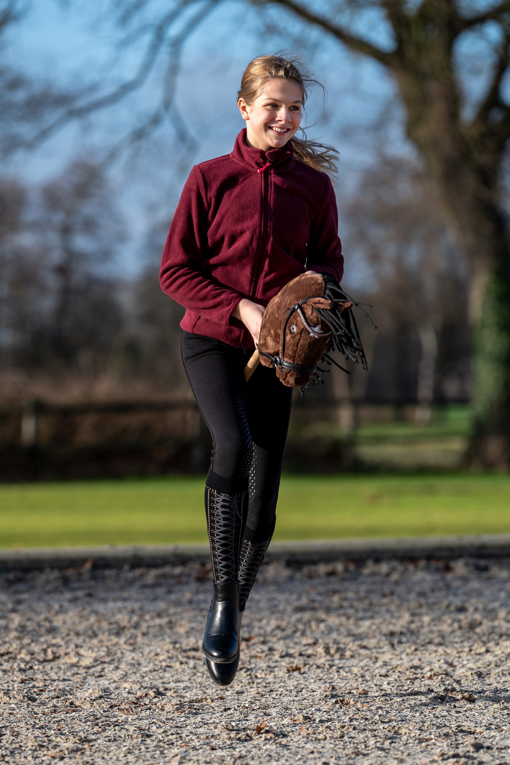 Het Hobby Horse speelgoedpaard combineert een gedetailleerd polyester hoofd met een stevige houten stok van 40 cm. Het wordt geleverd met een hoofdstel van 100% polyurethaan, dat onder de oren is vastgenaaid en indien gewenst voorzichtig met een schaar verwijderd kan worden. Dit model is geschikt als basis voor hobby horsing, waarbij extra accessoires afzonderlijk verkrijgbaar zijn.