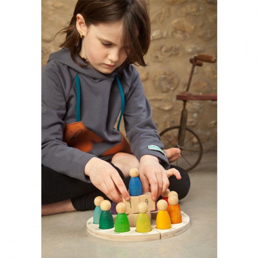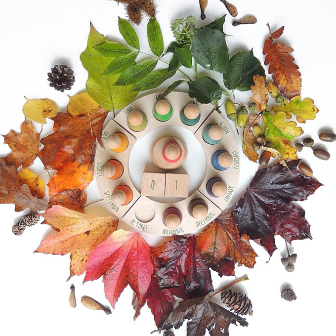 Een bijzondere kalender om het begrip tijd, de seizoenen en de datum inzichtelijk te maken voor kinderen. De set bestaat uit een 4-delige houten ring met daarop de maanden aangeduid in het Nederlands, 12 houten poppetjes in regenboogkleuren, 2 houten blokjes met getallen en een houten bakje.