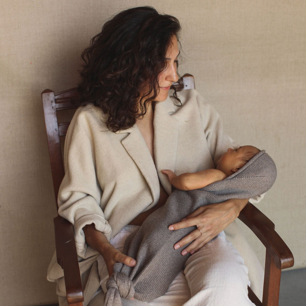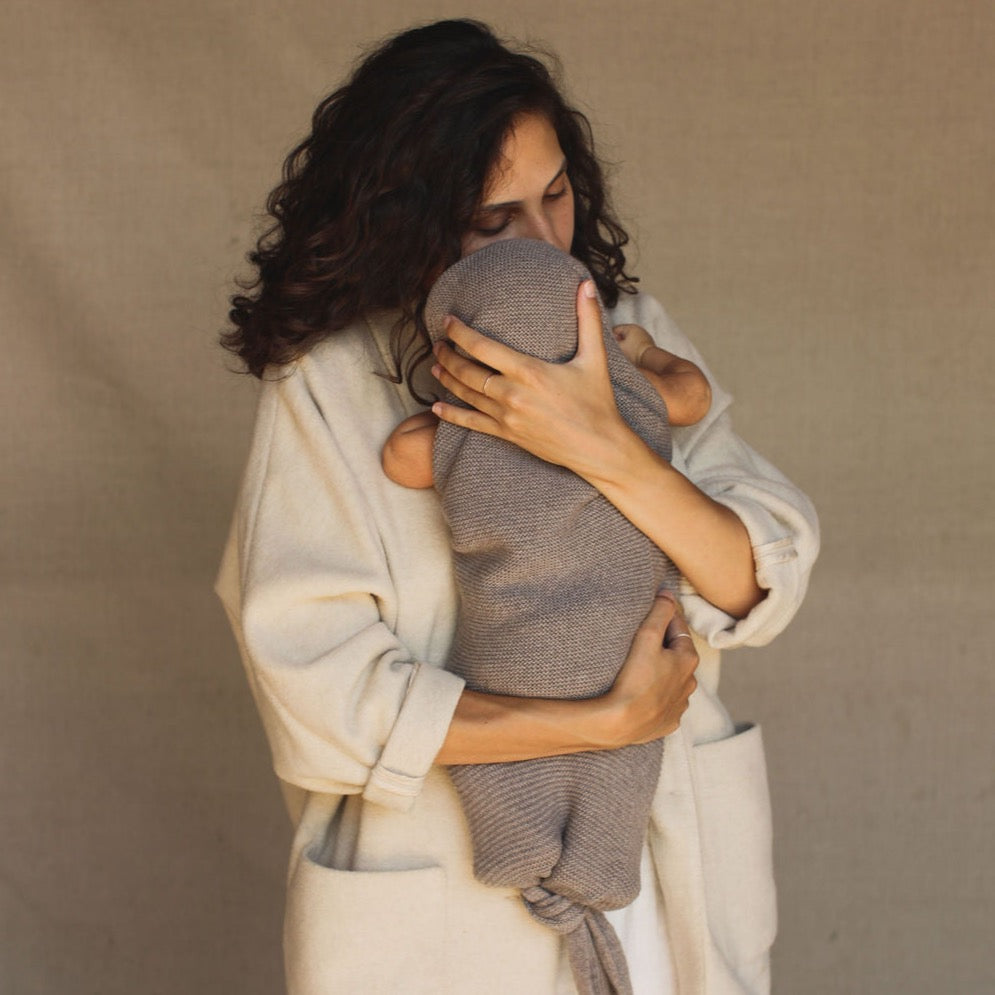 De cocon groeit mee met de groei van een baby: leg de knoop hoog bij pasgeborenen en laat hem zakken naarmate de baby groeit. Voor extra warmte en comfort kan het kapje over het hoofdje van de baby geplaatst worden. Armpjes mogen in de cocoon, maar ook erbuiten.