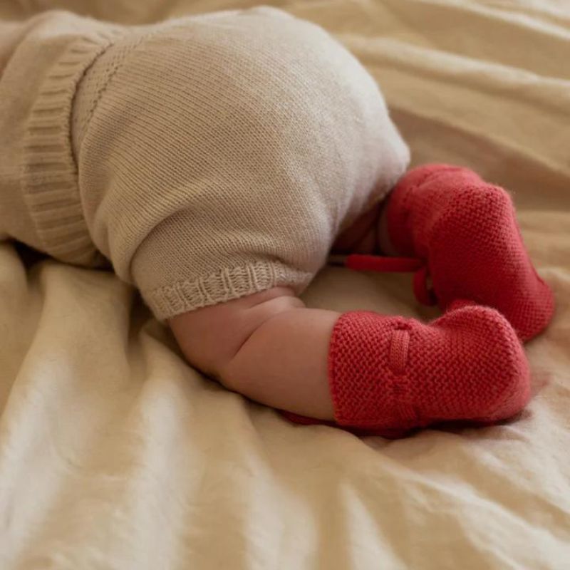 Deze schattige slofjes zijn gebreid van 100% zacht merino wol. Ze zijn perfect te dragen in alle seizoenen. Doordat de slofjes geen naden bevatten en niet jeuken, dragen ze erg comfortabel. Dankzij het handige koortje blijven ze goed zitten. Dus fijn trappelen en draaien zonder de slofjes te verliezen.