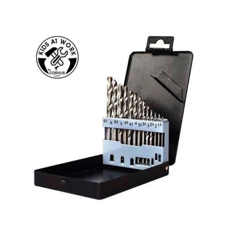 Deze 13 verschillende HSS spiraalboortjes in verschillende maten, kun je plaatsen in de handboor van Kids at Work. Daarmee kunnen kinderen elk gewenst gaatje boren in hout, metaal en kunststof materiaal.