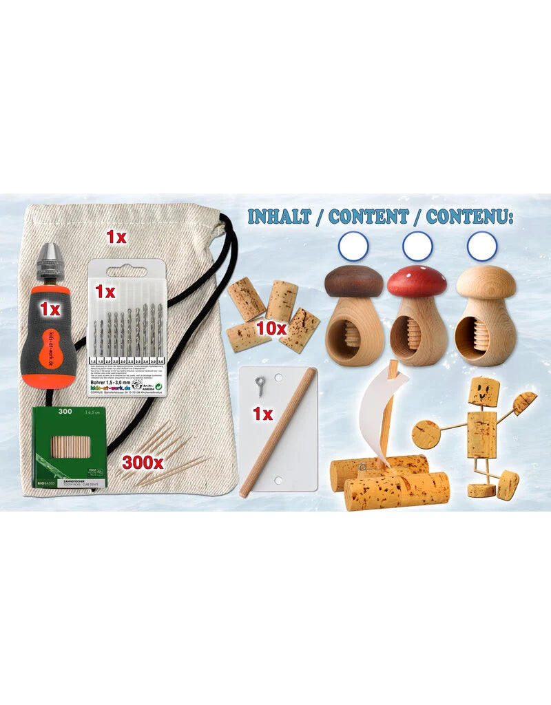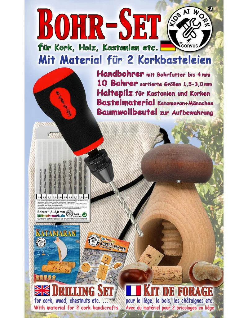 Met de Kids at Work Borenset kunnen kinderen veilig en creatief aan de slag met het boren in kastanjes, kurk en hout. Deze set is ideaal voor het maken van figuren en constructies, vooral tijdens het kastanjeseizoen.