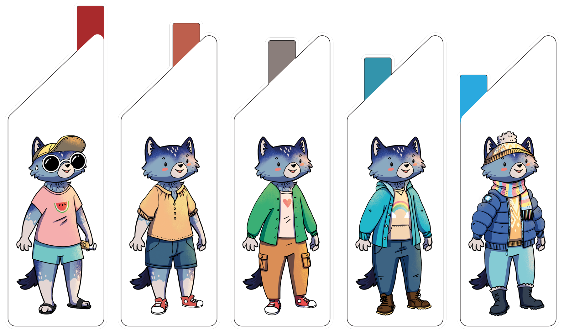 - Kleurige symbolen die kinderen helpen beslissen welke kleding ze nodig hebben (jas, paraplu, zonnebril)