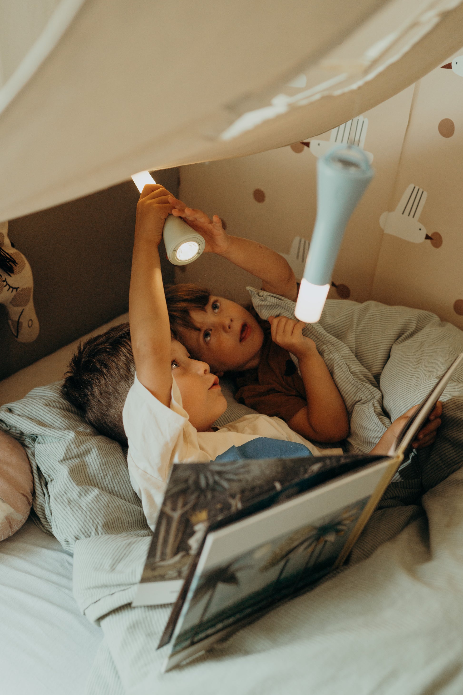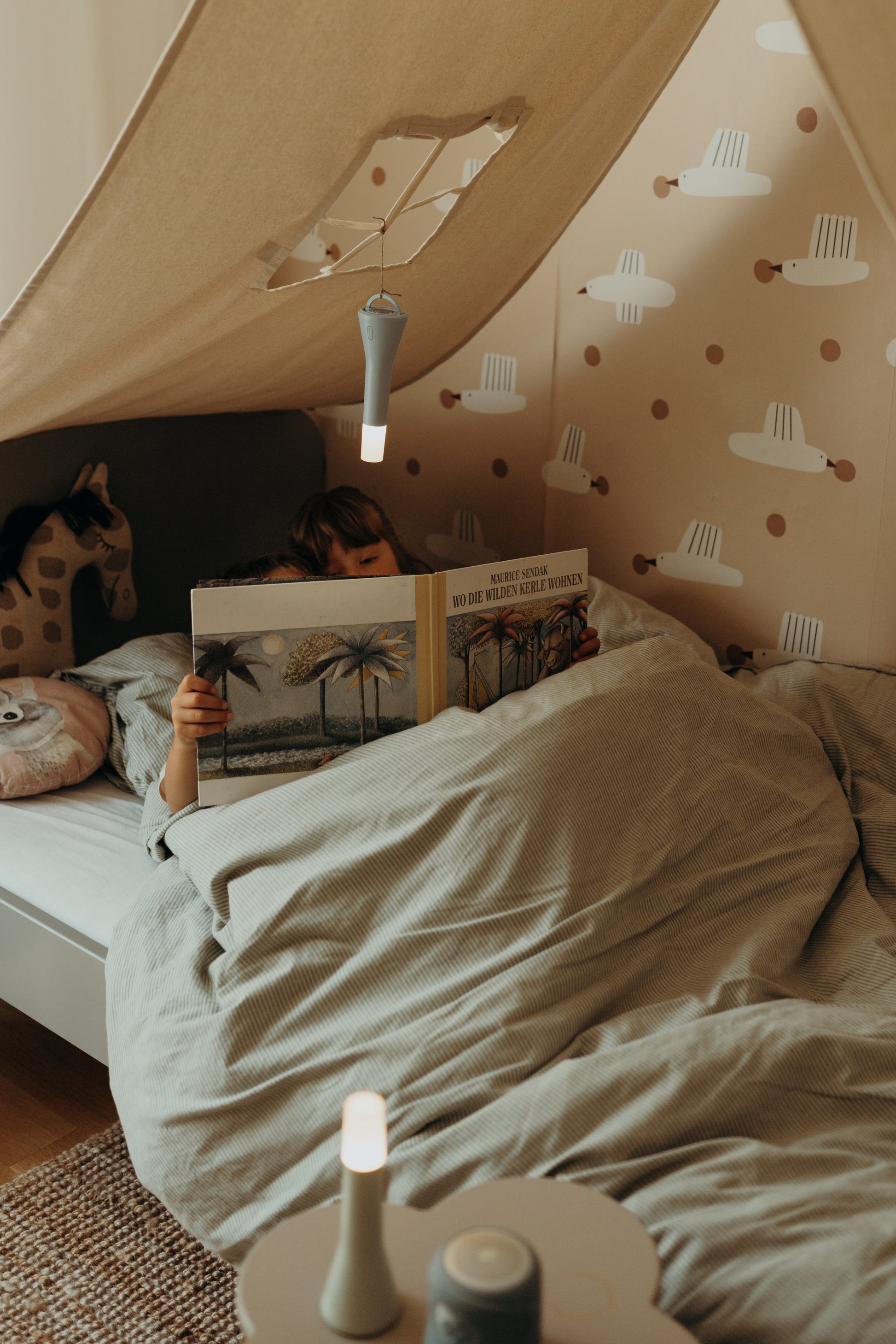Een speels accessoire voor nachtelijke avonturen, dat geruststelt in het donker en monsters afschrikt. De multifunctionele zaklamp kan gebruikt worden als zaklamp, tafellamp of hanglamp.