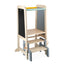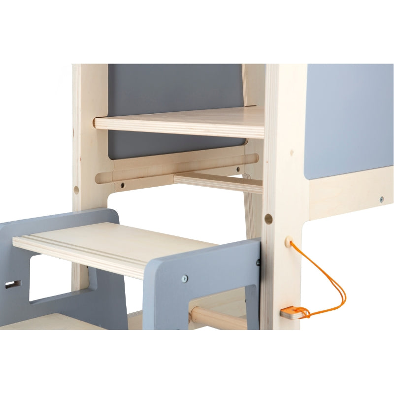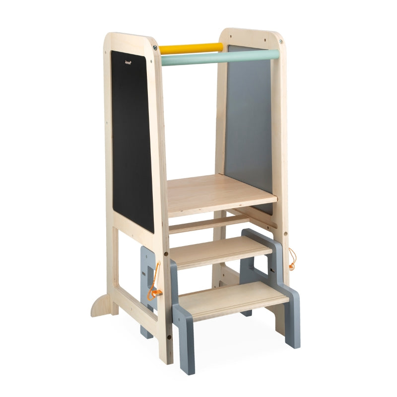 De constructie van het product maakt dat het kind volkomen veilig in het bijzijn van de ouders mee kan genieten van een kijkje in de keuken. Dankzij de 2 hoogte-instellingen (van 32,5 tot 40,5 cm) groeit de toren mee. De kruk is afneembaar, hierdoor kunnen zelfs de allerkleinsten opstappen. Deze keukenhulp is ook nog eens voorzien van een krijtbord zodat het met boodschappenlijstjes of tekeningen kan worden versierd.