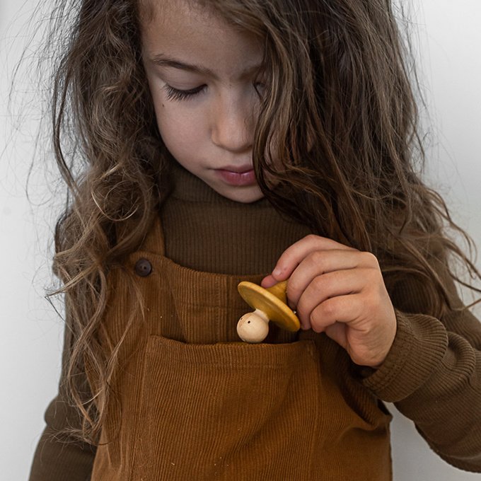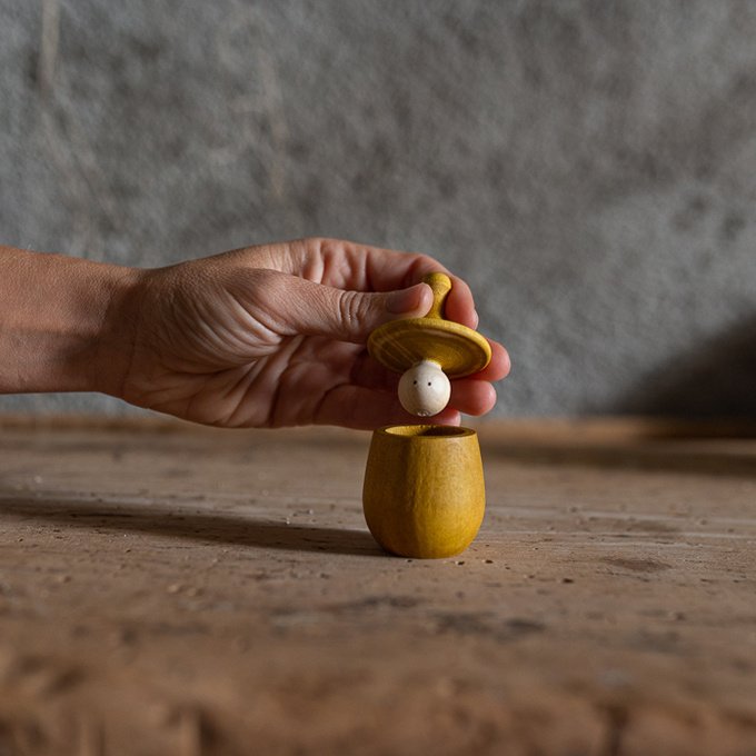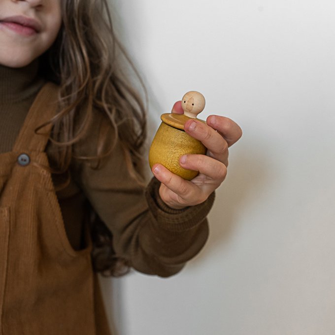 Een superlief wensdoosje voor piepkleine kostbaarheden. Een bijzonder steentje, de eerste melktandjes, een briefje waarop je je zorgen schrijft zodat de magie van de nacht ze kan laten verdwijnen... Dit houten potje heeft een deksel dat je er op twee manieren kan opzetten: met het mannetje naar binnen of naar buiten. Leuk voor piepkleine hebbedingetjes maar dit wensdoosje kan zeker ook een rol spelen in het spel van je kind, om kleine spullen in te sorteren en te verstoppen. Of hoe leuk zouden ze staan op de keukenplank met gedroogde kruiden?