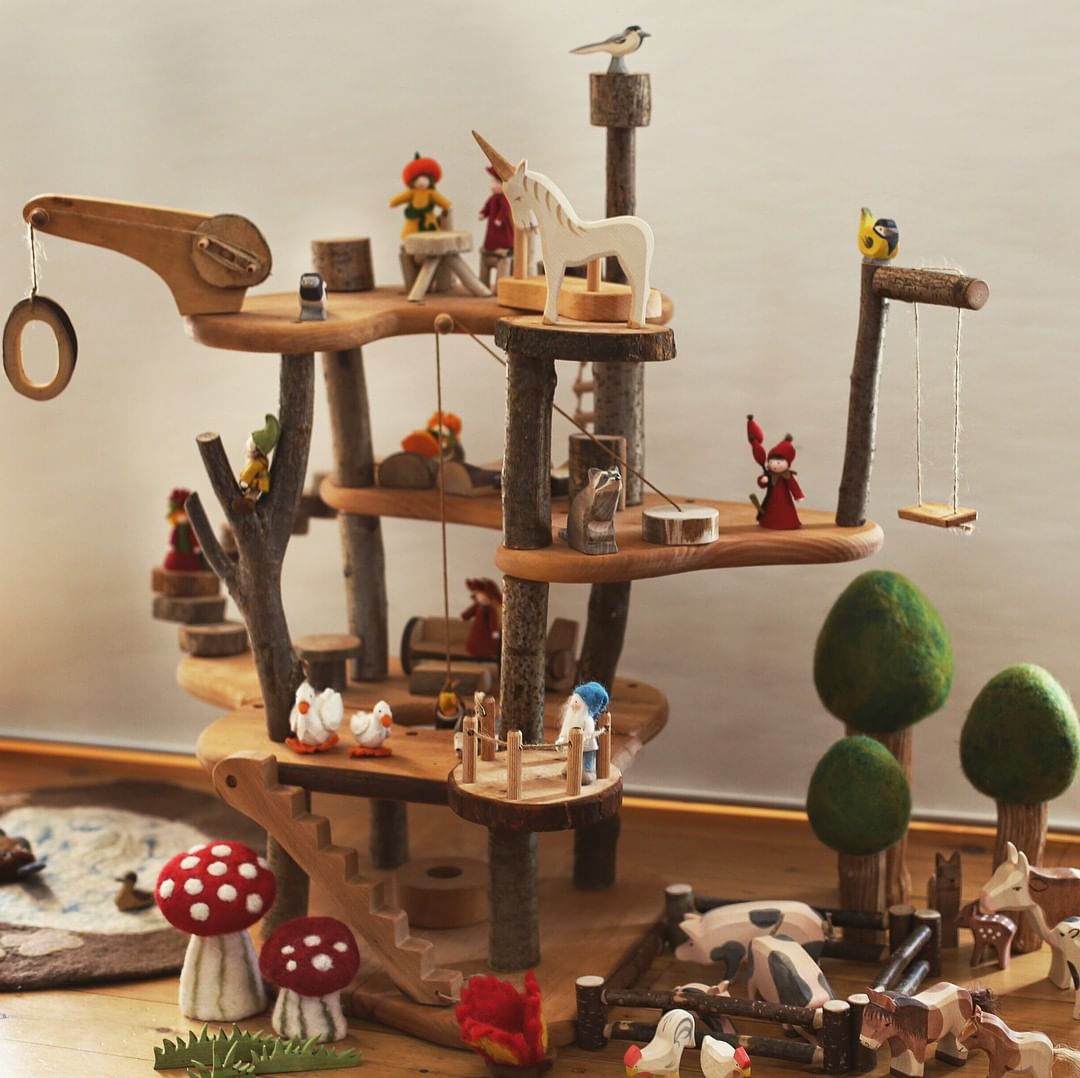 Het boomhuis is gemaakt van duurzaam Europees Elzen-, Hazelaar- en Beukenhout en is geolied met plantaardige lijnzaadolie. Doordat het hout alleen geolied is en niet gelakt behoudt het zijn natuurlijke textuur.