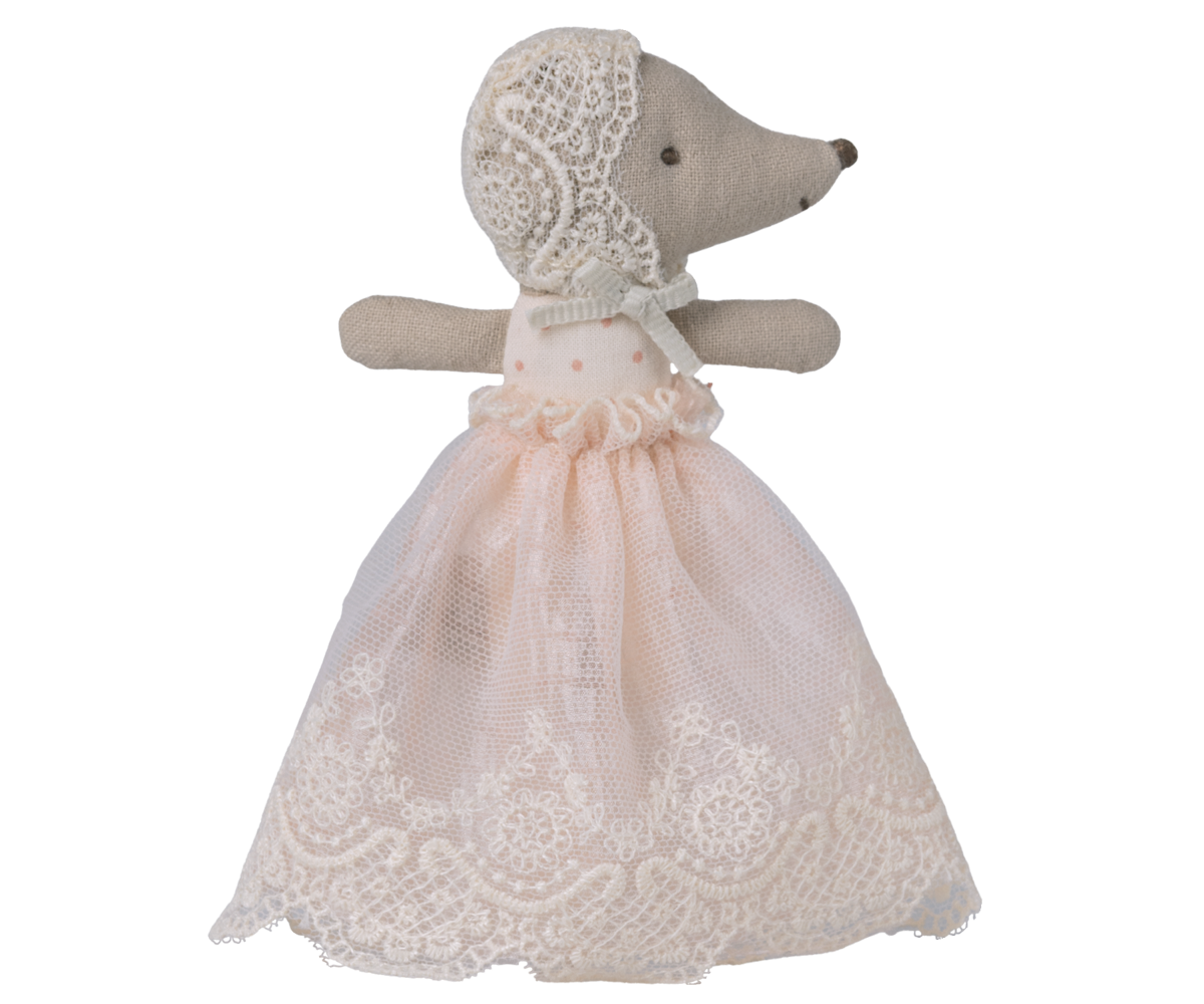 Dit piepkleine babymuisje draagt een zacht jurkje in poederkleur. Met haar kleine formaat past ze perfect in de babysitter of het MY-formaat meubilair van Maileg. Uit de Maileg collectie — een bijzonder cadeau voor jong en oud.