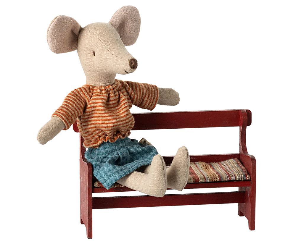 De muisjes van Maileg genieten van hun comfortabele houten bank! Deze prachtige rode bank is handgeschilderd, wat zorgt voor unieke variaties in het ontwerp. Het zachte kussen bovenop de bank maakt het een ideale zitplaats voor de muizenfamilie.