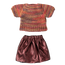 De Kledingset voor Muis is een kleurrijke keuze. Deze set bestaat uit een gebreide blouse met meerdere kleuren en een rok in glanzend roze.