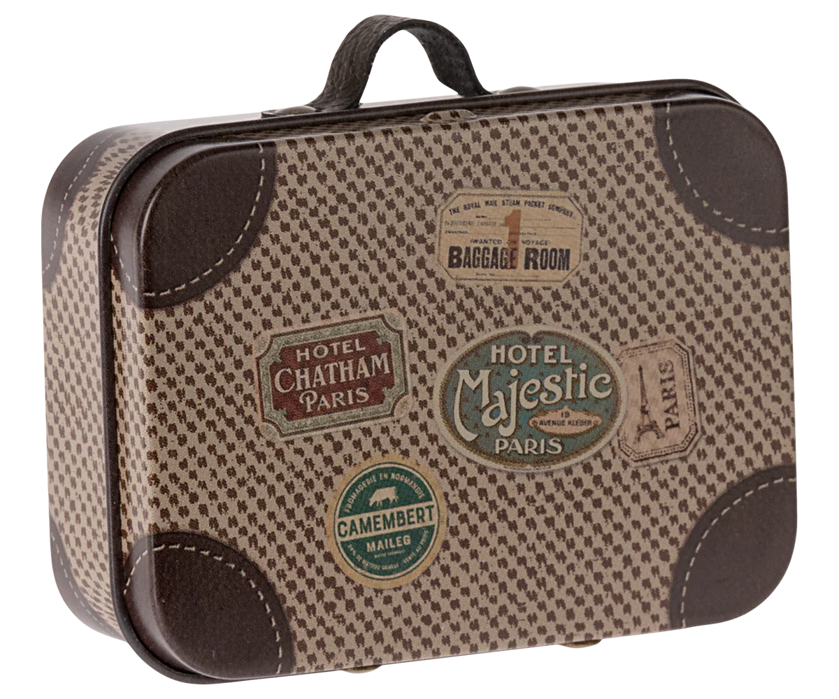 De Maileg muisjes reizen in stijl met deze prachtige rode micro koffer! Deze kleine metalen koffer met kleurrijke illustraties is ideaal voor het opbergen van kleine voorwerpen of het meenemen van spulletjes door de muizen en kleine konijnen.