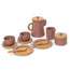 Dit schattige houten servies bestaat uit een koffie- of theekan, suikerpotje, melkkannetje, twee bordjes met lepeltjes en twee kop en schotels.