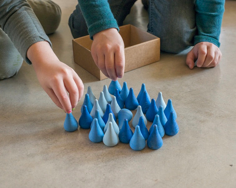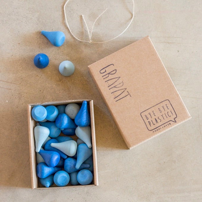 36 regendruppel (blauwe) elementen om mee te spelen, creëren of voor het maken van een mandala. Het idee achter dit speelgoed is dat het de fantasie van kinderen stimuleert. Dat zij helemaal vrij zijn om te bepalen welk doel het speelgoed dient en wat voor spel ze erbij verzinnen.