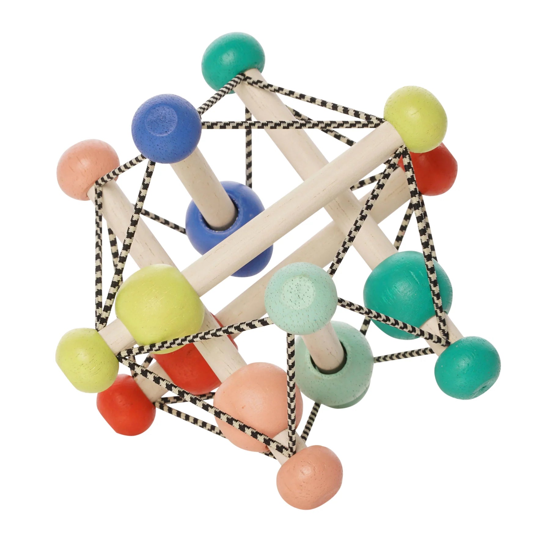 Het bijzondere ontwerp van elastische koorden en houten staven kan je in elkaar drukken en springt daarna vanzelf terug in zijn oorspronkelijke vorm - fascinerend voor baby's! De gekleurde kralen schuiven heen en weer over de staven en maken een zacht rammelend geluid dat de zintuigen prikkelt.