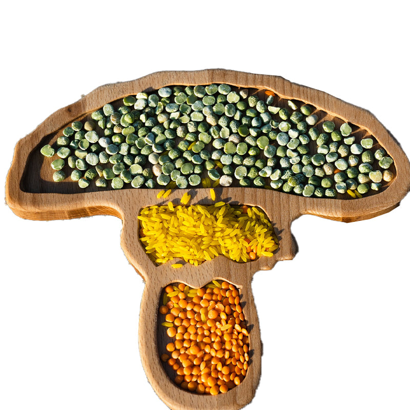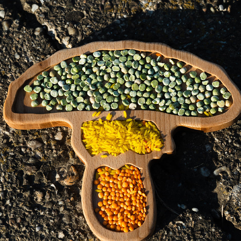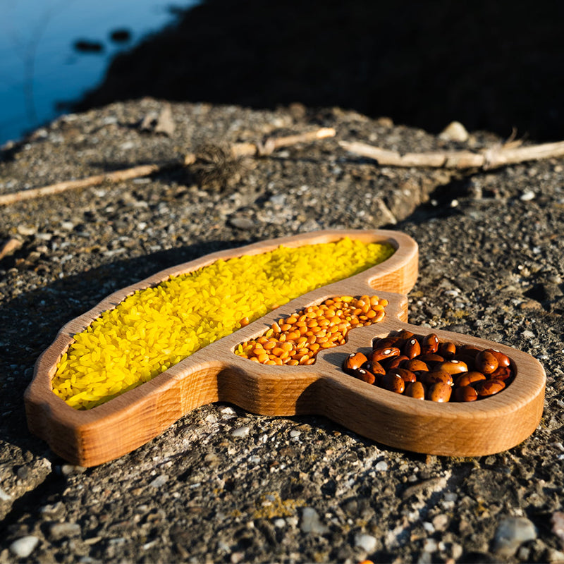 Deze houten sensorische tray in de vorm van een paddenstoel is prachtig educatief houten materiaal dat past binnen het montessori onderwijs. Gebruik dit dienblad bij verschillende thema's samen met gekleurde rijst, droge groente of andere natuurlijke materialen.