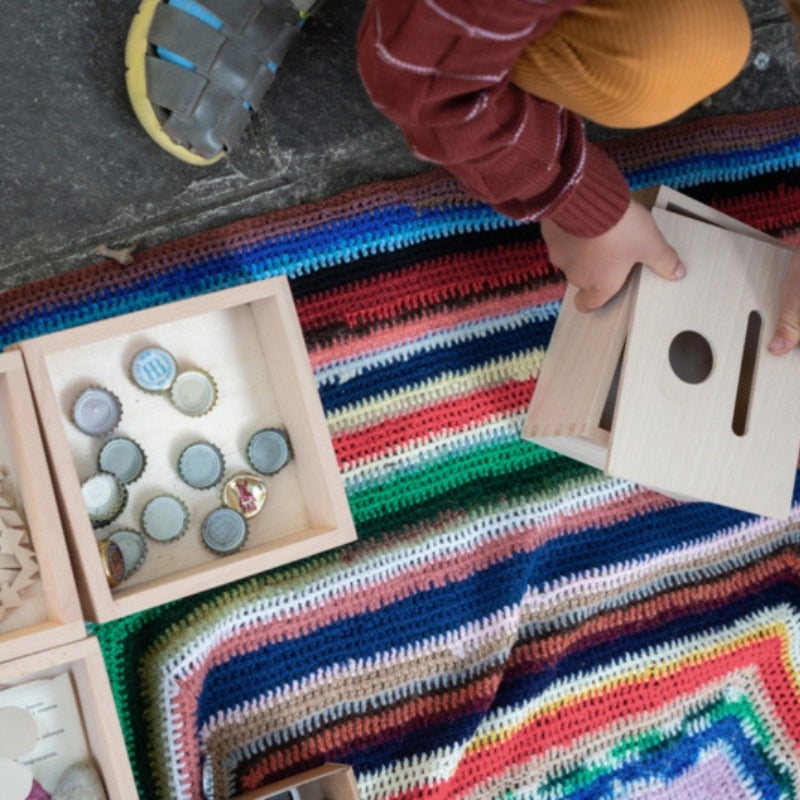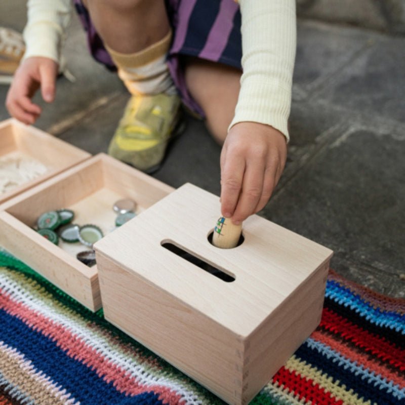 Een magische doos om stukjes in te passen, te verzamelen, te bewaren of te ruilen. Speelgoed dat in het doosje gaat zie je niet meer, maar het is er nog steeds! Hiermee kunnen baby’s en peuters zichzelf door al hun leerfasen navigeren.
