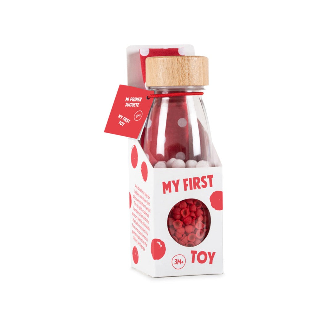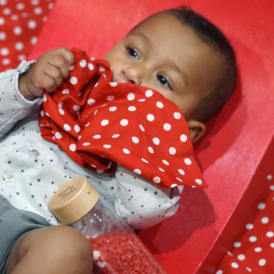 My First Toy bevat twee producten geïnspireerd door Pickleriaanse pedagogiek en ontworpen voor baby’s vanaf drie maanden oud: een lichte katoenen sjaal in felle kleuren en een sensorische fles Sound Bottle. My First Toy stimuleert het zicht, het gehoor en de motorische vaardigheden van baby’s en bevordert tegelijkertijd vrij en spontaan spelen. Door de lichtheid van de stof kan de baby het gemakkelijk met zijn handen vastpakken. Bovendien stimuleren de contrasterende kleuren van deze kleurrijke sjaal met stippen haar nog onvolwassen gezichtsvermogen. Om met hem te spelen, kun je de bergvormige sjaal naast hem neerleggen terwijl hij ligt, zodat hij hem kan zien en gemakkelijk kan pakken. De zakdoek stimuleert de spontane activiteit van de baby; hij zal zijn aanwezigheid snel opmerken en het in de mond nemen om het te verkennen. De Sound Bottle, gemaakt in dezelfde tinten als de sjaal, produceert stimulerende geluiden die een unieke zintuiglijke ervaring bieden. Om met de Sound Bottle te spelen, hoef je alleen maar te schudden. De elementen die het bevat, zullen dus aangename geluiden produceren die de baby uitnodigen om het met zijn ogen te volgen en het geluid van de verschillende onderdelen te identificeren. Onze flessen begeleiden de baby in zijn ontwikkeling en nodigen hem uit om te experimenteren en zich te concentreren.
