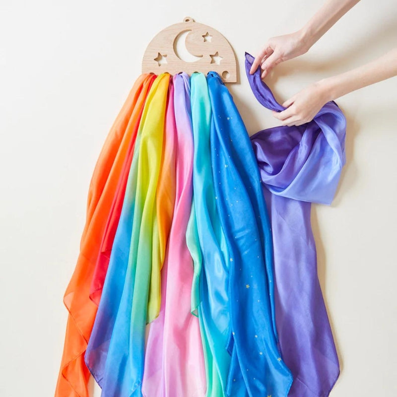 Prachtige houten, platte kapstok met sterren om de speelzijde aan op te hangen. Ideaal voor een opgeruimd huis of klaslokaal. Gemakkelijk en leuk voor kinderen die leren om voor hun speelgoed te zorgen. Geschikt voor alle Sarah's Silk stoffen.