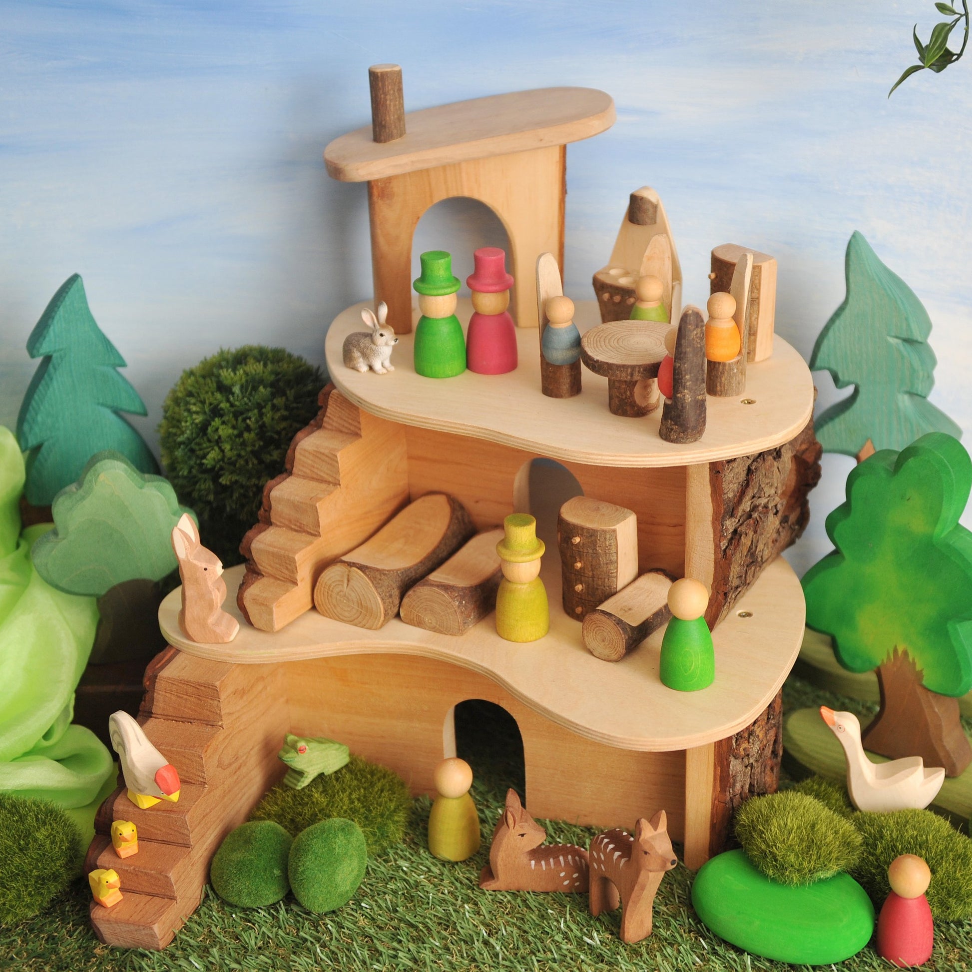 Superleuke set voor in de slaapkamer van het poppenhuis. De set bestaat uit 2 grote bedden, een kinderbedje en een machtkastje.Het meubelsetje is gemaakt van duurzaam Europees Elzenhout en Hazelaar en is geolied met plantaardige lijnzaadolie. Doordat het hout alleen geolied is en niet gelakt behoudt het zijn natuurlijke textuur.